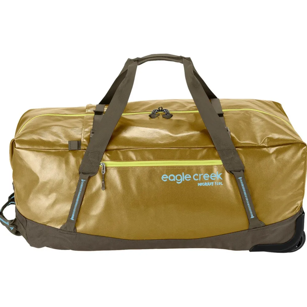 Die Migrate Wheeled Duffel 130 von eagle creek, ist eine Reisetasche mit der „No matter what warranty“. Durch spezielle Technologien ist die Tasche maximal wasserbeständig, abriebfest und vor eindringendem Staub geschützt. Eine spezielle Räderkonstriktion schont Deinen Rücken. Die vorhandenen Rucksackträger, lassen sich verstauen. Das Hauptfach ist durch eine sehr große Öffnung gut zugänglich. Die Fronttasche ermöglicht schnellen Zugriff auf das Wichtigste. Ein weiterer Pluspunkt ist die Verwendung von 100 % recyceltem Material. Die Migrate Wheeled Duffel 130 ist ein treuer Begleiter ein Leben lang.