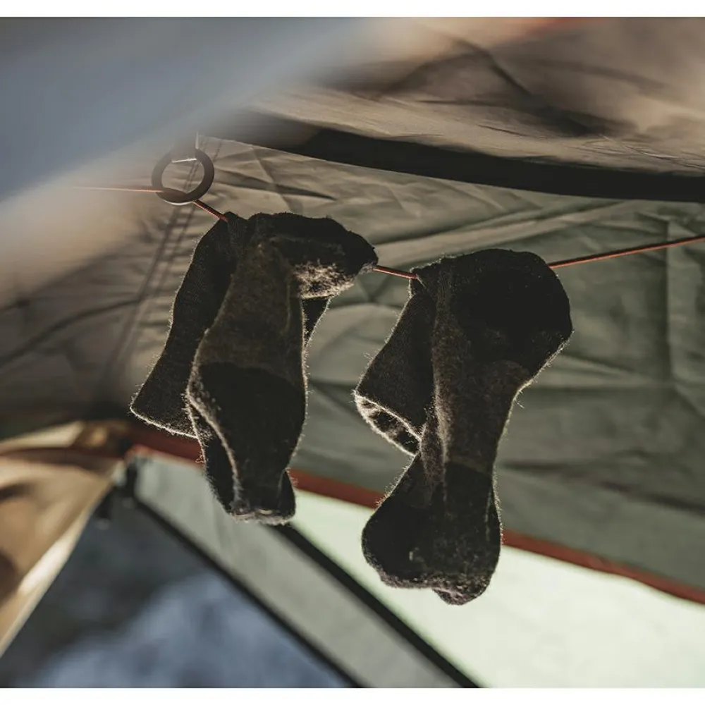 Auch praktisch: im Inneren des Zeltes findest Du eine Wäscheleine sowie eine Lampenaufhängung vor, Organizer-Fächer gibt es auch. So ist stets für beste Übersicht, Ordnung und den nötigen Durchblick gesorgt. Für den Fall der Fälle ist auch ein kleines Reparatur-Kit beigelegt, sodass ein Schaden nicht zwingend das Ende der Tour bedeutet. Das außen liegende Aluminium-Gestänge wird einfach eingeklippt, wodurch lästiges Einfädeln entfällt.
