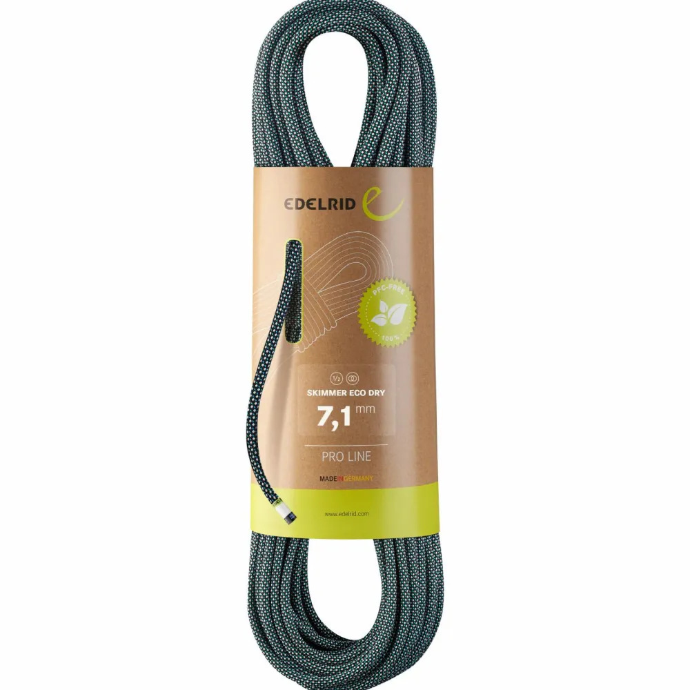 Das Skimmer Eco Dry 7,1 Halbseil von Edelrid ist das leichteste und dünnste Halbseil auf dem Markt. Zudem verfügt es über eine PFC-freie Eco-Dry Veredelung. Das Seil kann durch die 3D-Lapcoiling Technologie direkt ausgepackt und eingesetzt werden. Hier muss es keine Angst mehr vor einem lästigen Verkrangeln geben.Das Seil ist als Halb-und als Zwillingsseil zertifiziert, und kann so bei vielen Einsatzbereichen, wie beispielsweise dem Eisklettern eingesetzt werden. Zudem ist das Seil bluesign zertifiziert. Dies bedeutet, dass das Seil umweltfreundlich hergestellt wurde. Neben den vielen technischen Eigenschaften sieht das Seil einfach gut aus. Es macht Lust auf Klettern. Die Thermo-Shield Technologie ermöglicht zudem ein angenehmes Handling.