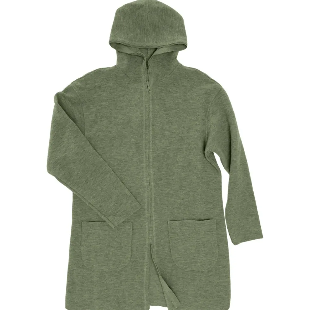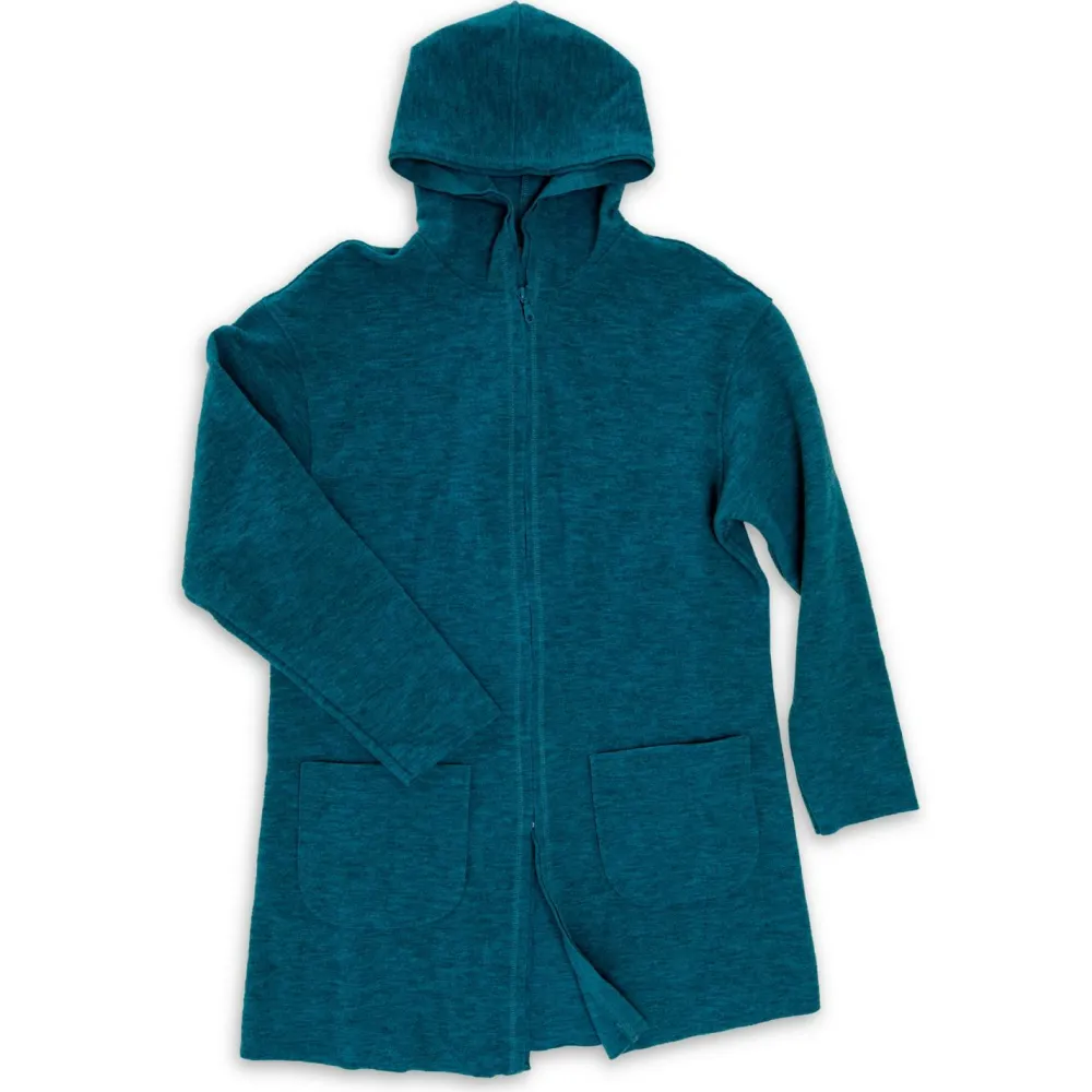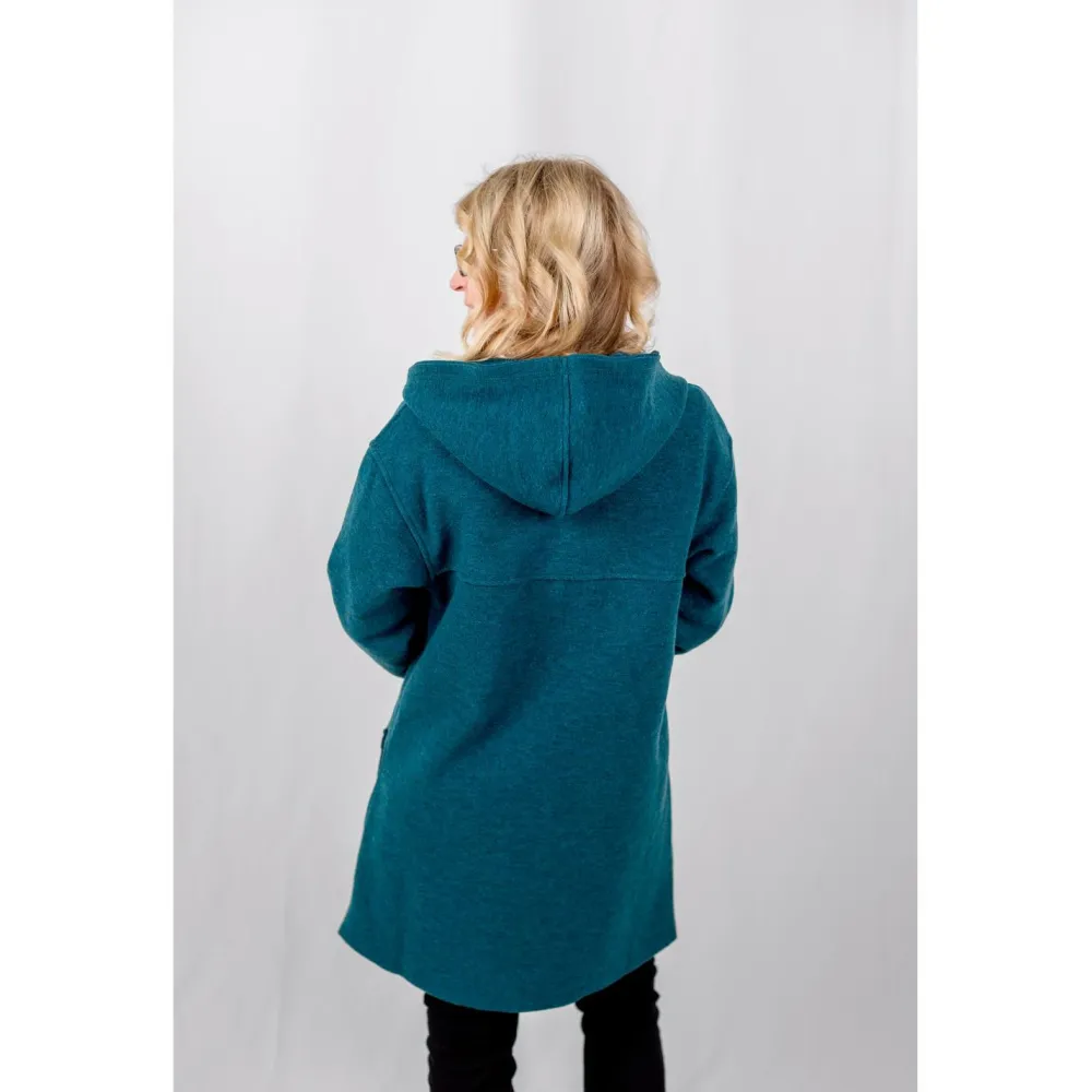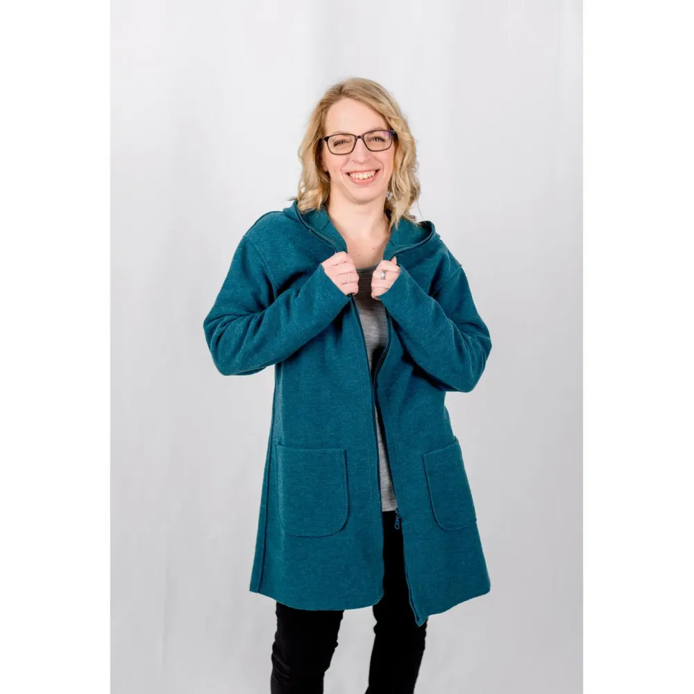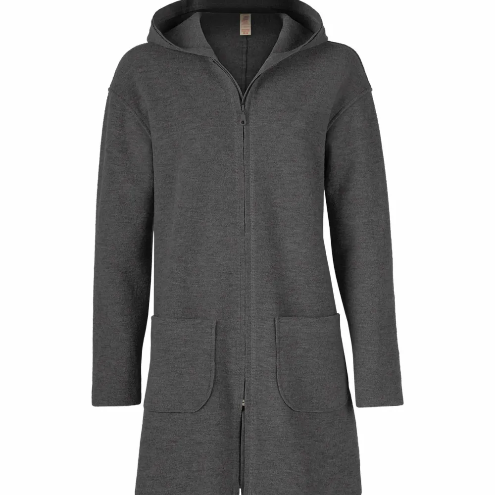 Er ist komplett aus weicher Wolle gefertigt, die warm hält und außerdem natürliche, funktionelle Eigenschaften mitbringt. Der Walkstoff ist nämlich atmungsaktiv und geruchshemmend. So ist an langen Tagen für hohen Tragekomfort gesorgt. Die große Kapuze und die zwei großen Fronttaschen machen den alltagstauglichen Look komplett.