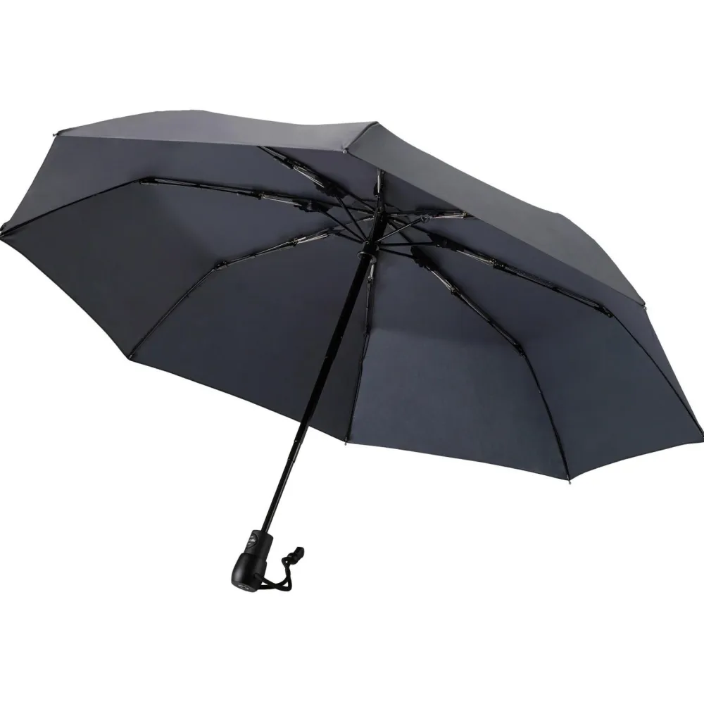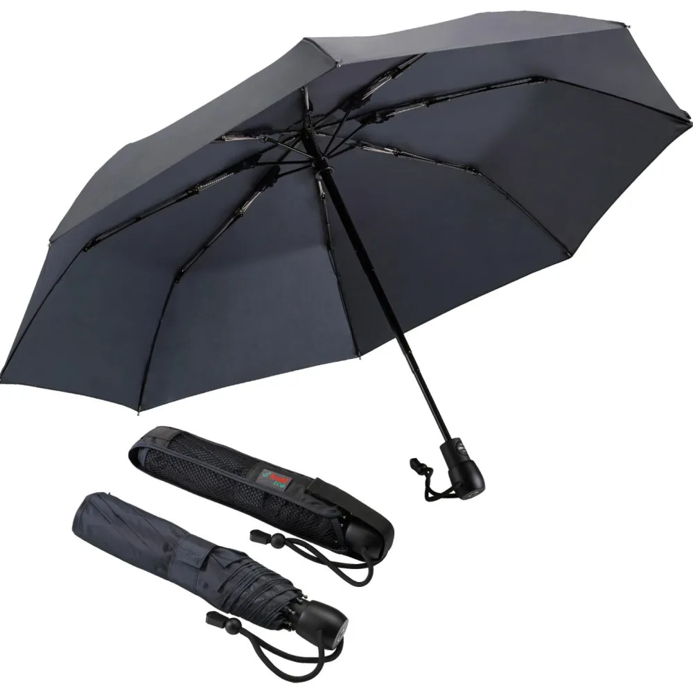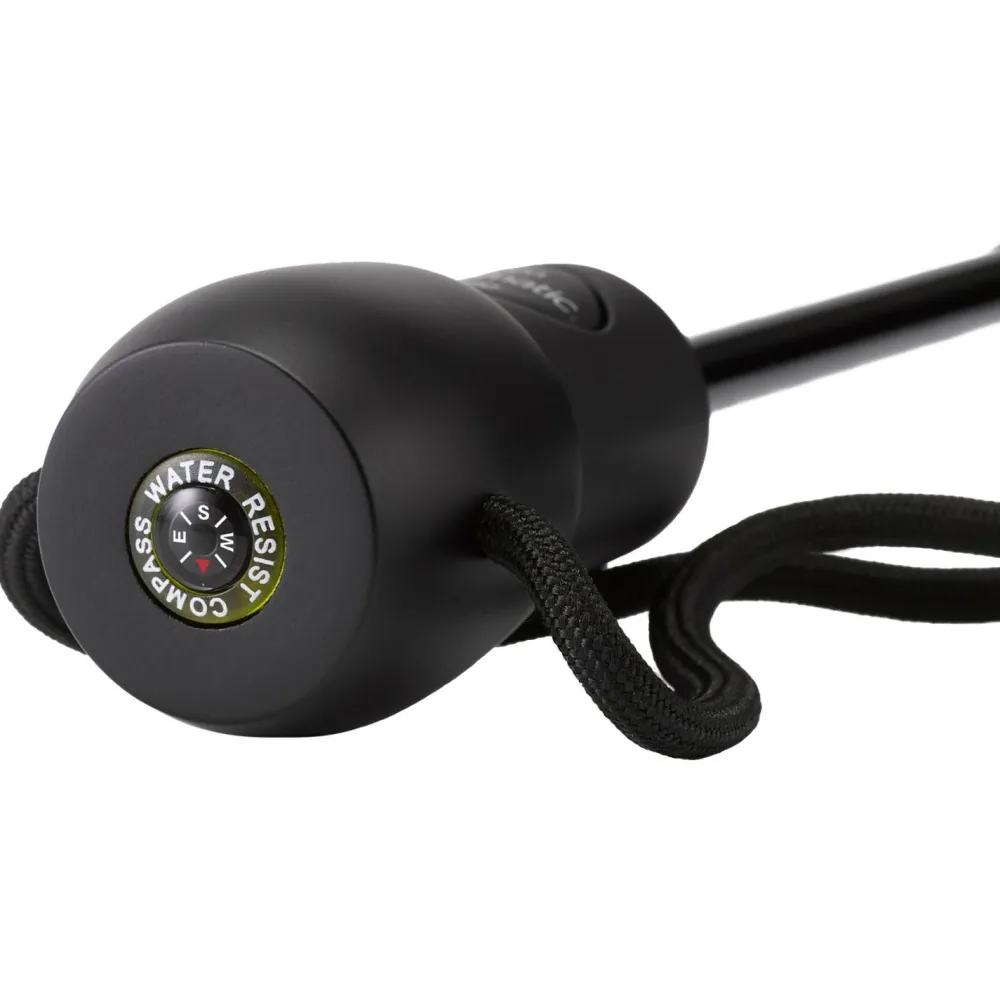 Der Light Trek ECO Automatik wiegt ohne Hülle gerade einmal 336 Gramm und ist trotzdem extrem stabil im Wind. Der Schirm öffnet und schließt automatisch per Knopfdruck. Sollte ein starker Wind den Bezug einmal umstülpen: Ein Kopfdruck genügt, und er schließt automatisch und unbeschadet. Außerdem hat er doppelte Nähte zwischen den Segmenten, eine robuste Nylonhülle mit Netzeinsatz, eine Fixierschlaufe und Karabiner, sowie einen im Griff mit integriertem Kompass.