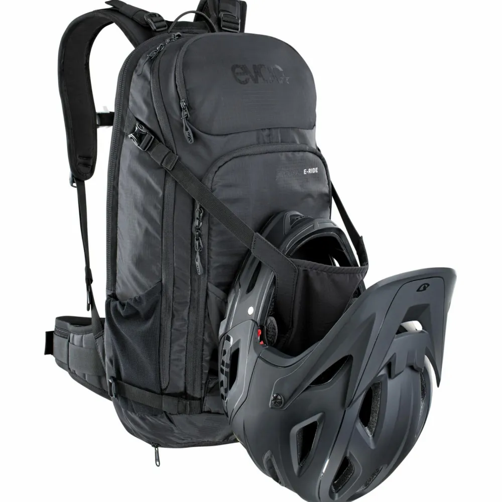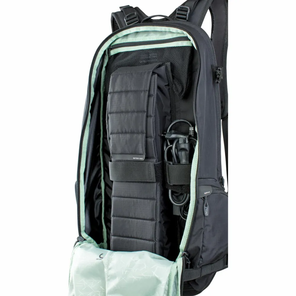 Ideal für das E-Mountainbiken – der FR Trail E-Ride 20 von Evoc. Der durchdachte Bikerucksack besitzt einen integrierten Rückenprotektor und ist zudem mit einem gepolsterten, internen Akkufach ausgestattet. Hier ist der Ersatzakku sicher aufbewahrt und vor Beschädigungen geschützt. An der Helmhalterung können Halbschalen wie Integralhelme befestigt werden. Zusätzliche Fächer dienen der übersichtlichen Organisation von Werkzeug und weiterem Equipment. Ladegerät und Kontrolldisplay besitzen gesonderte Fächer – so kann man das komplette E-Bike Equipment mitführen.