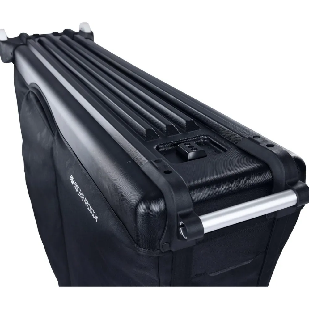 Die Tasche kombiniert ein leichtes Gewicht mit einer robusten Basis aus Polycarbonat, die Dein Bike zuverlässig vor Stößen schützt. Mit einer maximalen Radstandlänge von 130 cm deckt sie die meisten MTB-Modelle ab. Die austauschbaren Skate-Rollen und das zentral platzierte Clip-On Wheel sorgen für ruhiges Rollen und bessere Lastverteilung – ein echter Vorteil in Flughäfen oder Bahnhöfen.