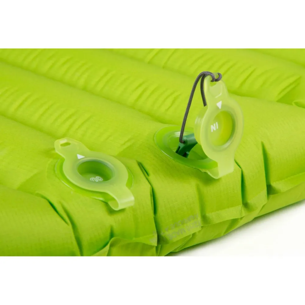 Exped stattet die Ultra 5R Isomatte mit dem leistungsfähigen und besonders gut haltbaren Flatvalve Ventil aus. In Kombination mit dem mitgelieferten Schnozzel Pumpbag wird die Matte zügig und mühelos aufgeblasen. Dafür ist weder Lungenkraft nötig, noch gelangt Feuchtigkeit über die Atemluft in die Matte.