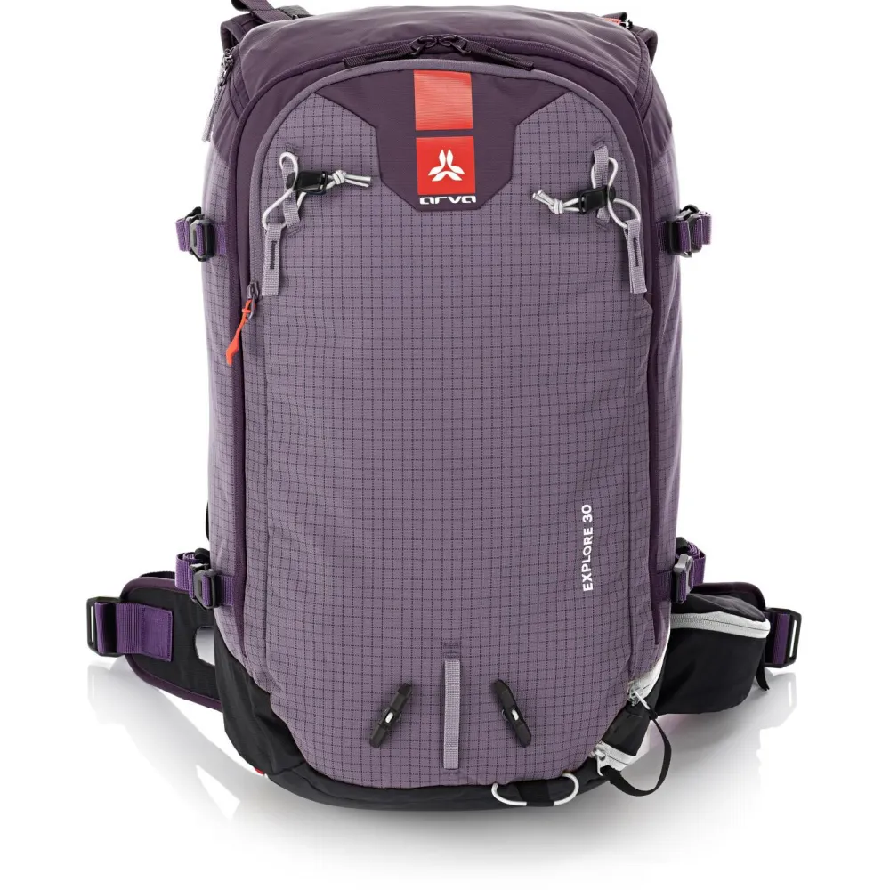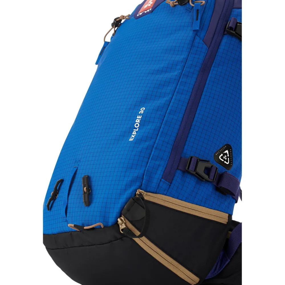 Das Skihalterungssystem erlaubt die Befestigung der Ski in Sekundenschnelle, während Snowboard, Splitboard oder Schneeschuhe sicher außen fixiert werden können. Zusätzliche Halterungen für Eispickel, Stöcke und Helm machen den Explore 30 zum echten Allrounder. Ein separates Fach für Lawinensicherheitsausrüstung, eine große Brillentasche und eine Tasche am Hüftgurt sorgen für Ordnung und schnellen Zugriff. Die Netztasche am Schulterträger ist perfekt für Softflasks oder kleine Trinkflaschen.