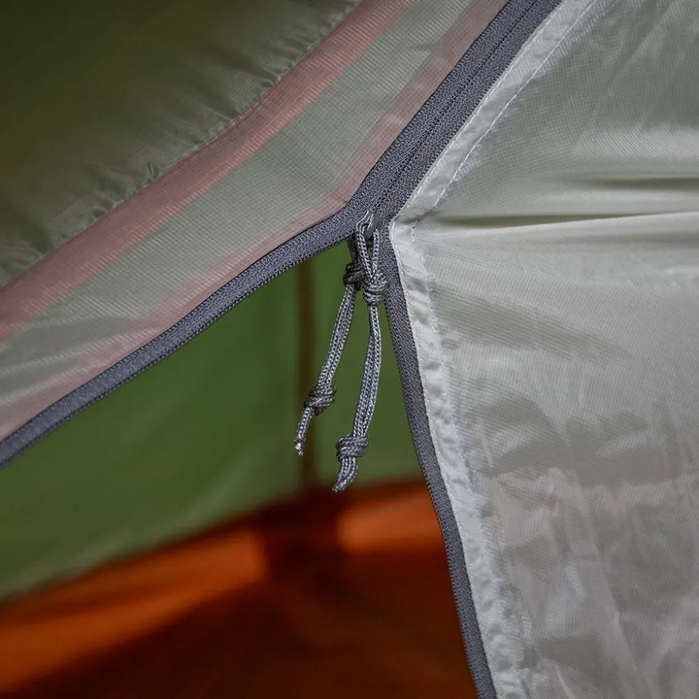 Die Abspannleinen sind aus dem besonders reißfesten Dyneema Gewebe hergestellt. Dank einer reflektierende Beschichtung sind die Leinen beim nächtlichen Toilettengang optimal sichtbar. Alle verwendeten Materialien am Ultraleichtzelt sind flammhemmend. Beim Außenzelt kommt ProTex 15 SRN Gewebe zum Einsatz. Das wind- und wasserdichte Material ist dank einer Beschichtung mit Silikon und Polyurethan gegen Durchfeuchtung geschützt und lässt den Regen an der Oberfläche abperlen.