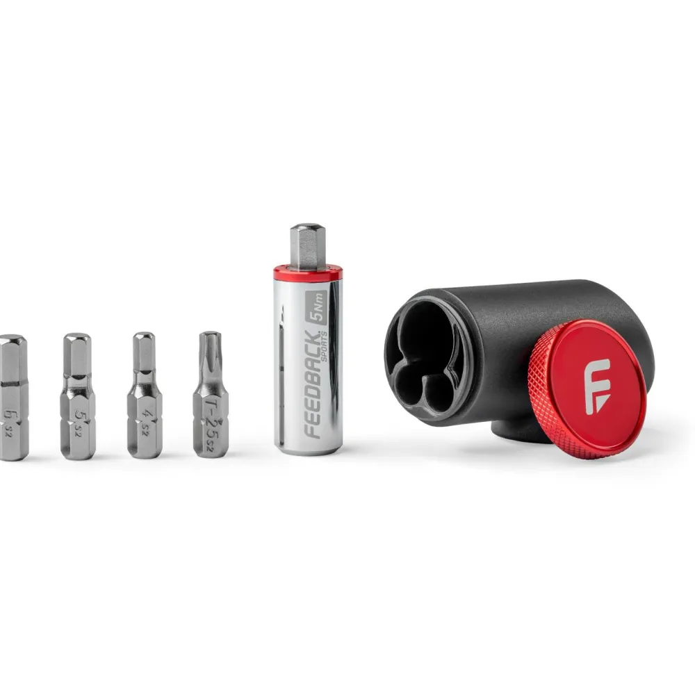 Der Bit Schrauber Reflex Fixed von Feedback Sports ist ein kompaktes Werkzeug für präzise Einstellarbeiten unterwegs. Im ergonomischen T-Griff stecken ein 5-Nm-Drehmomentadapter und vier S2-Stahlbits für typische Schrauben am Bike. Dank ¼“-Standard ist weiteres Zubehör kompatibel, und der einfache, ratschenlose Aufbau ermöglicht kontrolliertes Arbeiten auch auf engem Raum.
