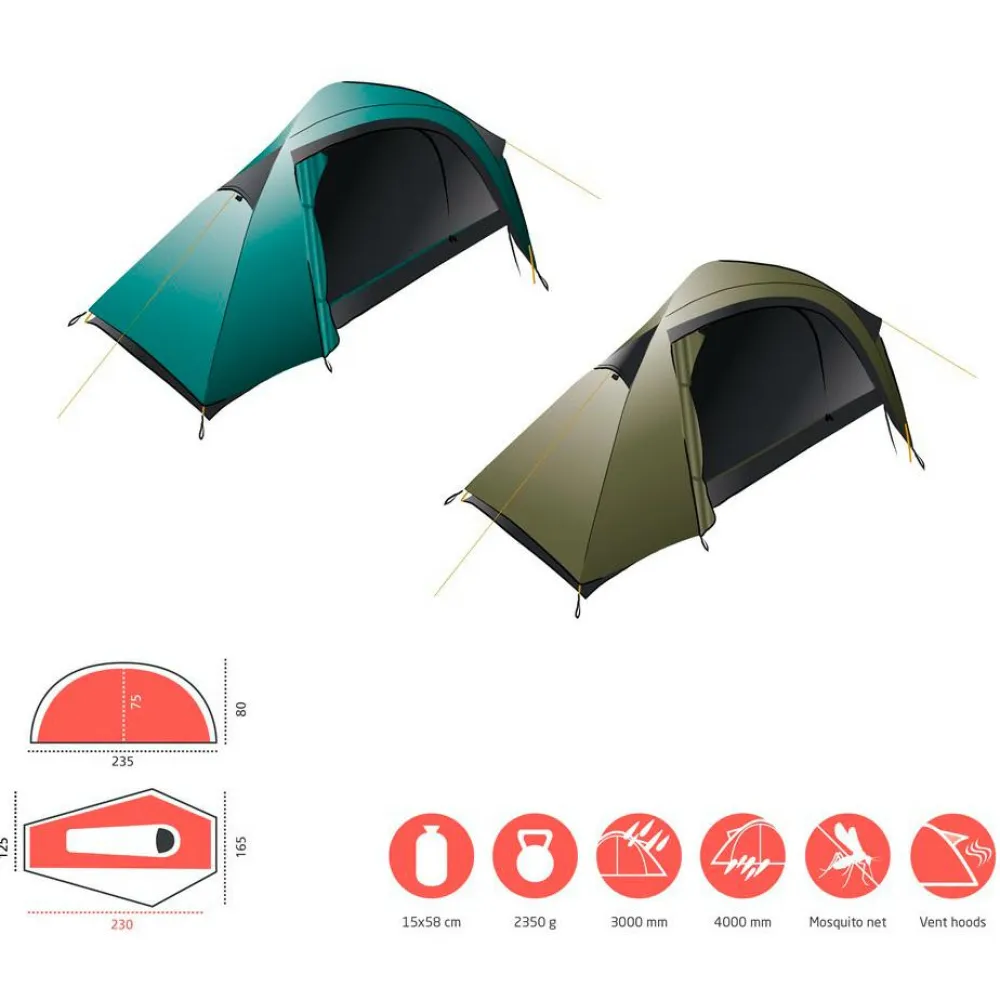 Das robuste Zelt für Trekking, Camping und Bikepacking bietet auf 230 cm Länge und maximal 125 Breite bequem Platz für eine Person. Seitlich bietet sich im Innenraum eine Menge Platz neben der Isomatte und auch im Eingangsbereich können Rucksack, Wanderstiefel und Packtaschen geschützt verstaut werden. Im Innenraum ist das 1-Personenzelt 75 cm hoch und erlaubt damit komfortables Sitzen. Das Apex 1 von Grand Canyon wiegt 2350 g und lässt sich für den Transport auf 15 x 58 cm komprimieren. Die Kombination aus guter Belüftung und zuverlässigen Wetterschutz macht das Zelt zur perfekten Unterkunft bei jedem Wetter.