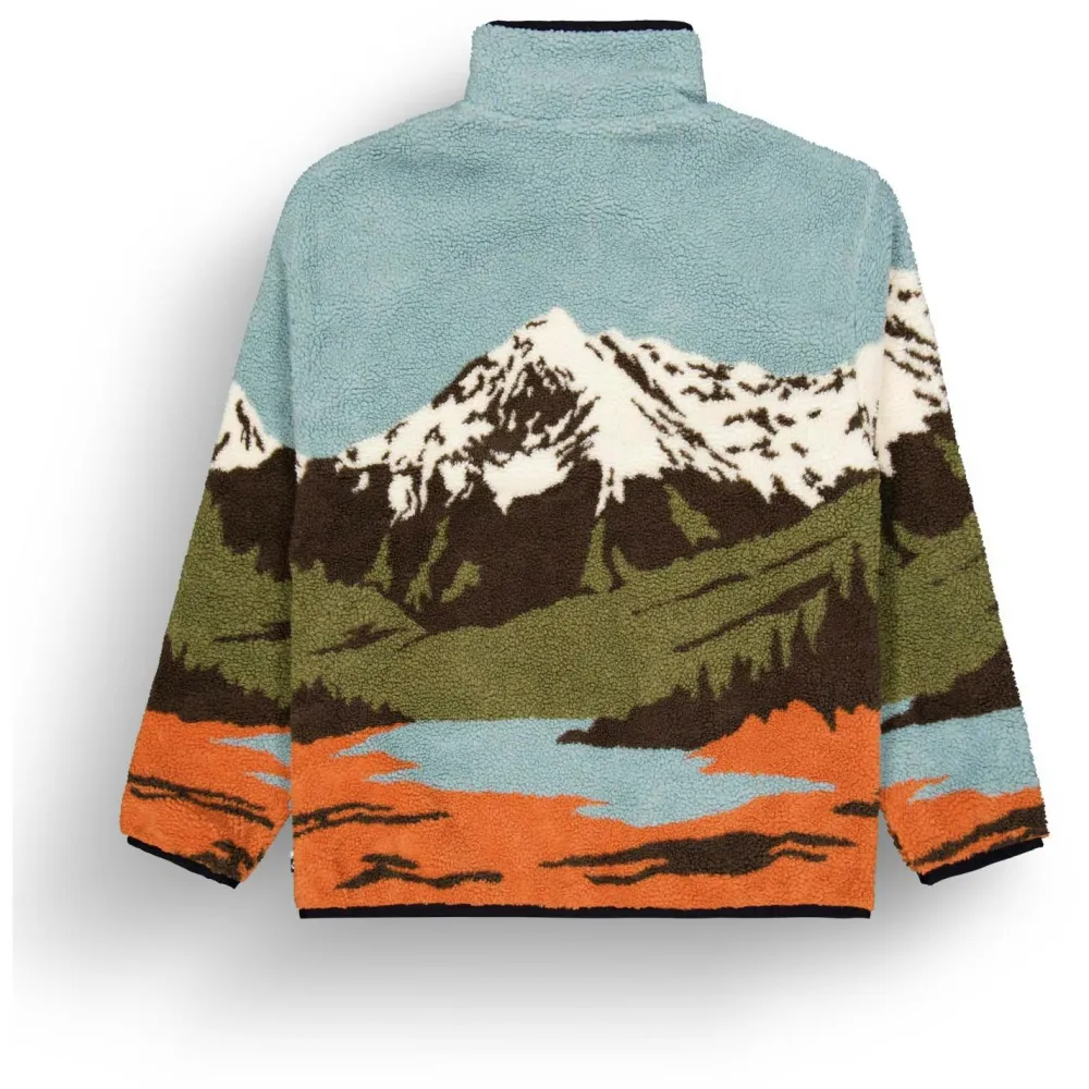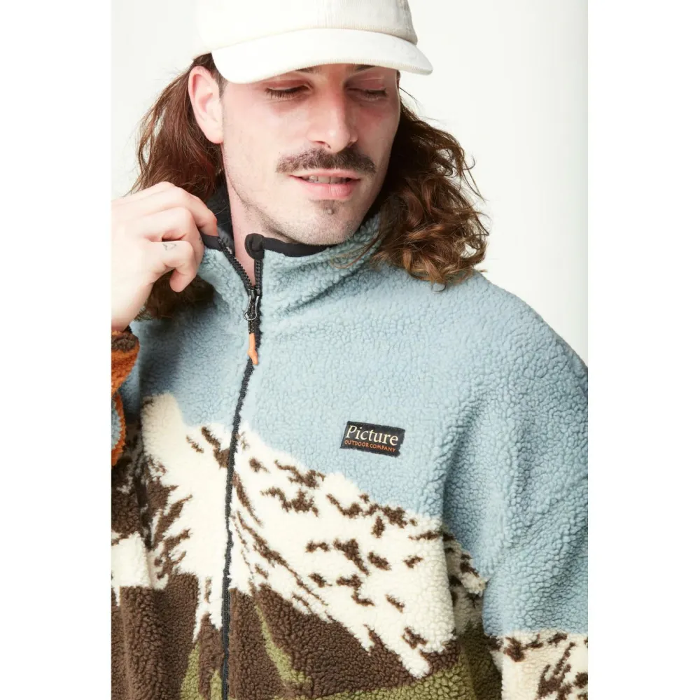 Ein großflächiges Landschaftsmotiv mit Bergen, Hügeln, Himmel und Seen ziert die Hafdals Zip Fleece Jacke von Picture. Dabei reicht das Bergmotiv vom Oberkörper, bis über die Ärmel und ergibt ein einheitliches Gesamtbild. Die Fleecejacke mit dem einzigartigen Motiv besteht aus warmem Sherpa Fleece und ist mit hohem Kragen, seitlichen Taschen und durchgehendem Frontreißverschluss ausgestattet. Picture verwendet zu 100% recyceltes Polyester für die Herstellung der Jacke und ergänzt das tolle Design mit einem kleinen Logo-Patch an der Brust.