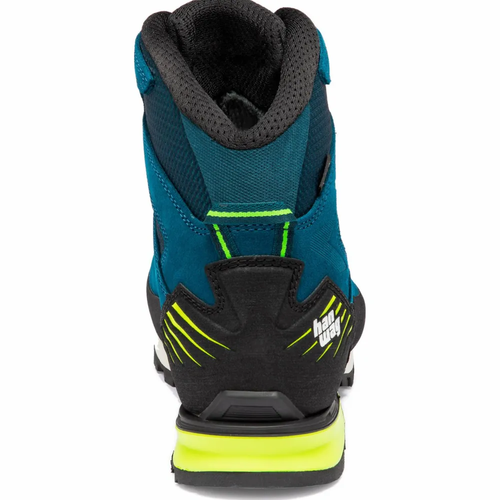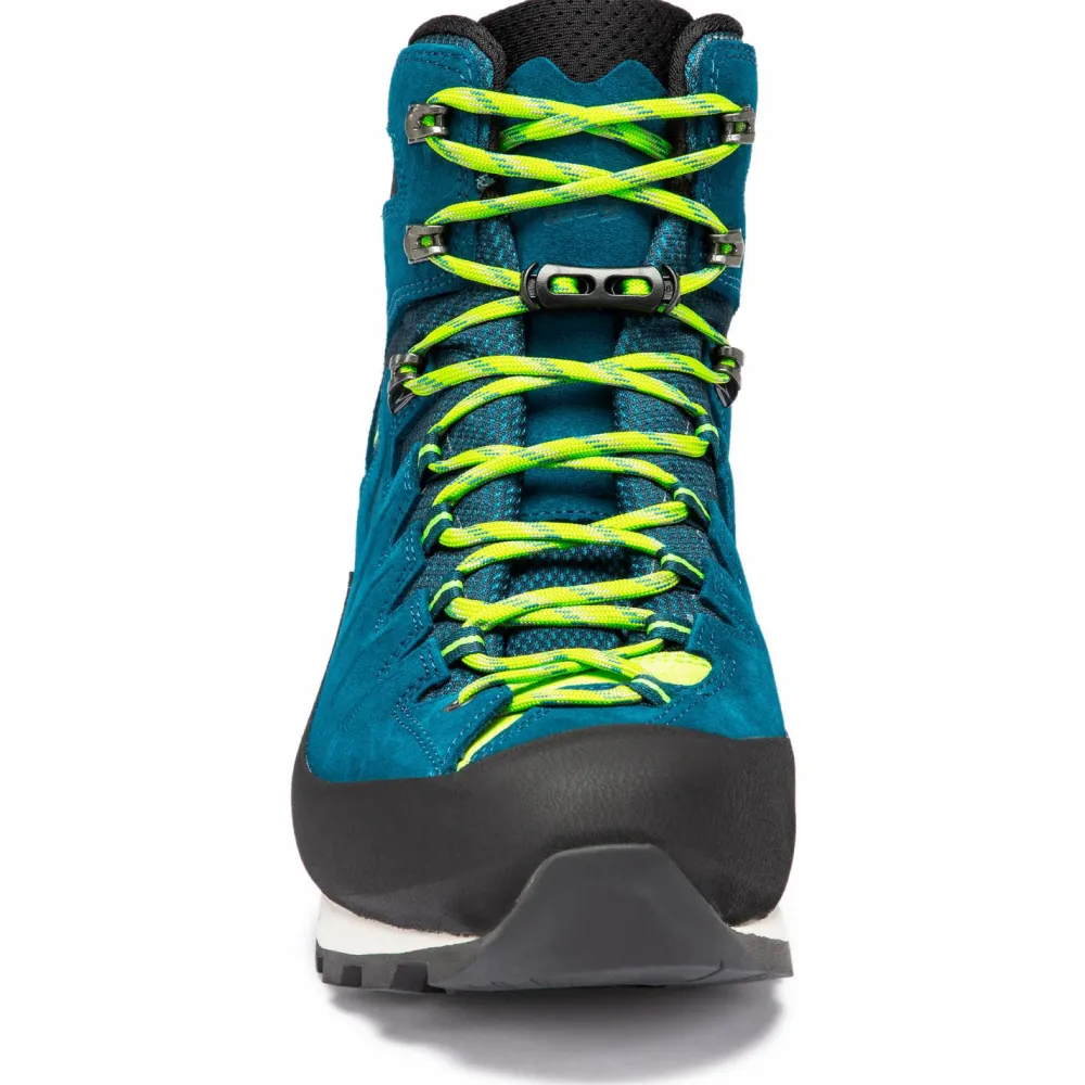 Die Sohlenkonstruktion ist ebenfalls überaus stabil und verwindungssteif, überrascht aber zugleich durch ein geringes Gewicht. Sie sorgt für ein ausgewogenes Verhältnis von Stabilität und Leichtigkeit. Die Vibram-Makra-Laufsohle gibt Dir einen guten Halt auch auf schwierigem Untergrund. Die Zwischensohle ist ein Mix aus PU, TPU und EVA. Sie dämpft Deine Schritte komfortabel und je nach Fußbereich unterschiedlich. So garantiert sie Präzision im vorderen Teil und Komfort im Fersenbereich. Ideal für technische Touren mit etwas mehr Gepäck. Die Alpine Wide-Leiste ist durch einen breiteren Vorfußbereich gekennzeichnet. Dadurch bleiben die Schuhe auch auf langen Strecken bequem.