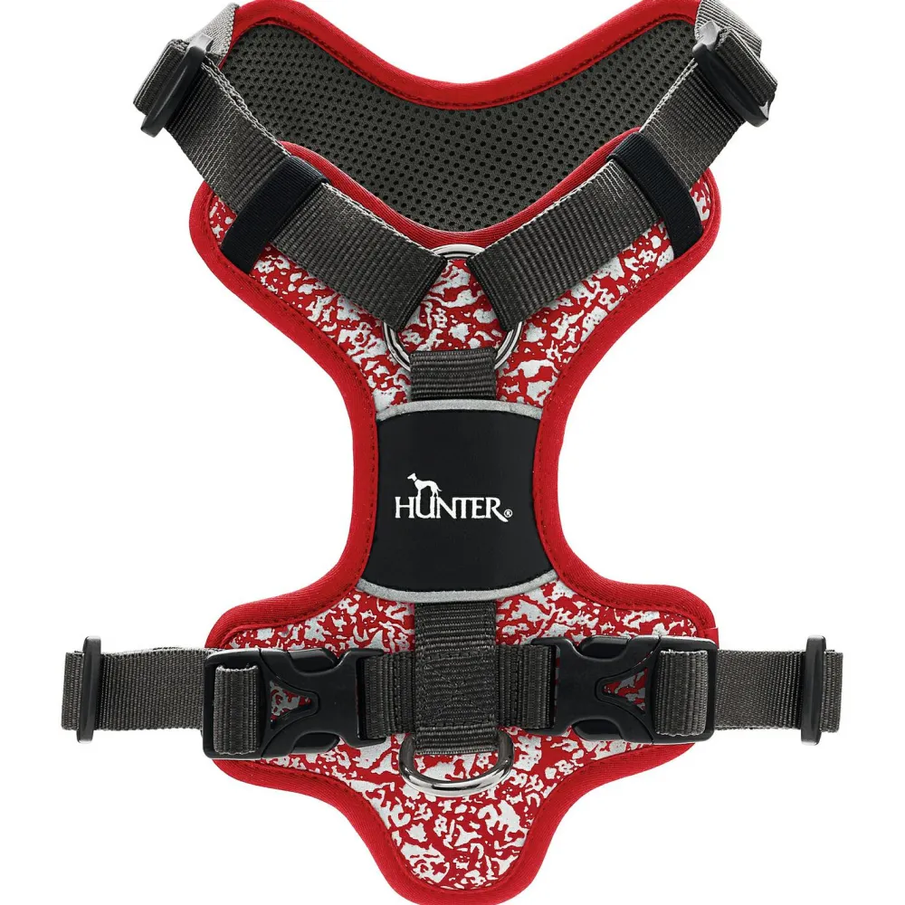 Das Harness Divo Reflect von Hunter bietet neben der ergonomischen Passform, einen hohen Komfort durch eine atmungsaktive Polsterung aus weichem Mesh-Material und viel Sicherheit in der Dämmerung und im Nebel. Das umlaufende reflektierende Material und der Camouflage-Print harmonieren besonderes gut mit dem Hundefell und sorgen bestimmt für einige Blicke und es fällt bei Tageslicht und in der Dunkelheit auf. Der zweite D-Ring ermöglicht das Anleinen auch im Brustbereich. Dank der 5-fachen Verstellmöglichkeiten lässt sich das Geschirr ganz individuell auf die Bedürfnisse und dem Körperbau der Fellnasen anpassen und sitzt wie eine zweite Haut.