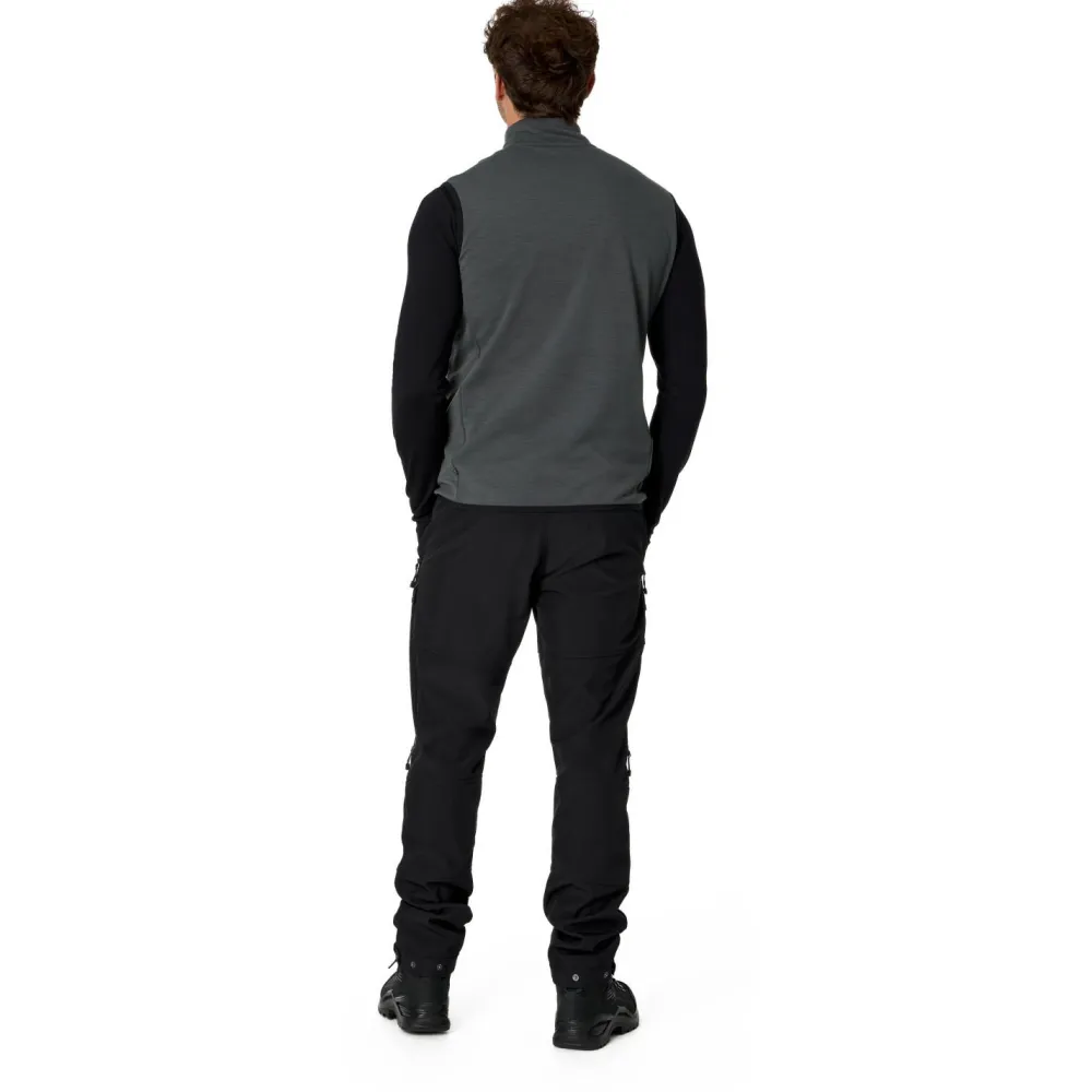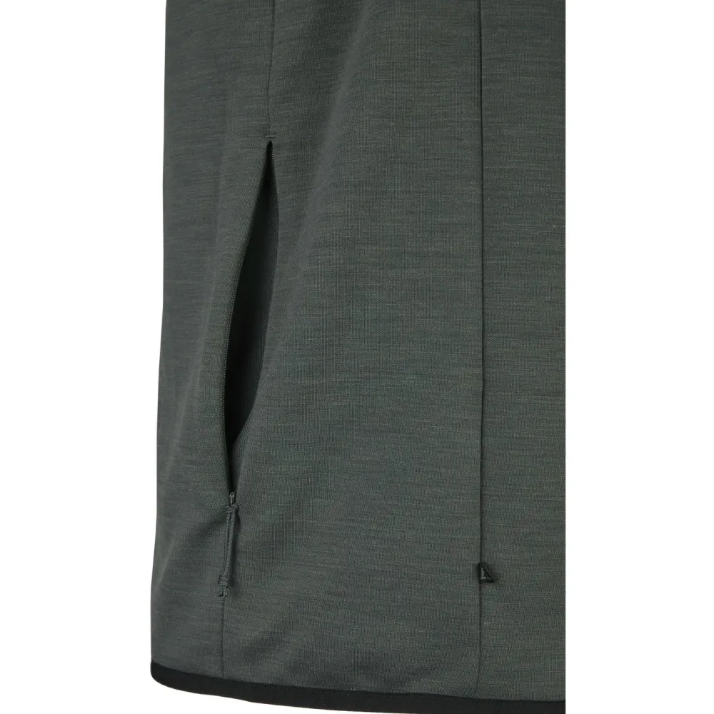 Mit 20 Prozent mulesingfreier Merinowolle (18,5 Micron) bietet Dir die Weste ein besonders angenehmes Tragegefühl. Merino ist atmungsaktiv, temperaturregulierend und geruchsneutral – perfekt für lange Tage unterwegs. Die synthetischen Fasern im Materialmix sorgen für Strapazierfähigkeit und Formstabilität, damit Du lange Freude an Deiner Weste hast. Die elastisch eingefassten Armausschnitte bieten Dir dabei volle Bewegungsfreiheit, ganz ohne Reibung.