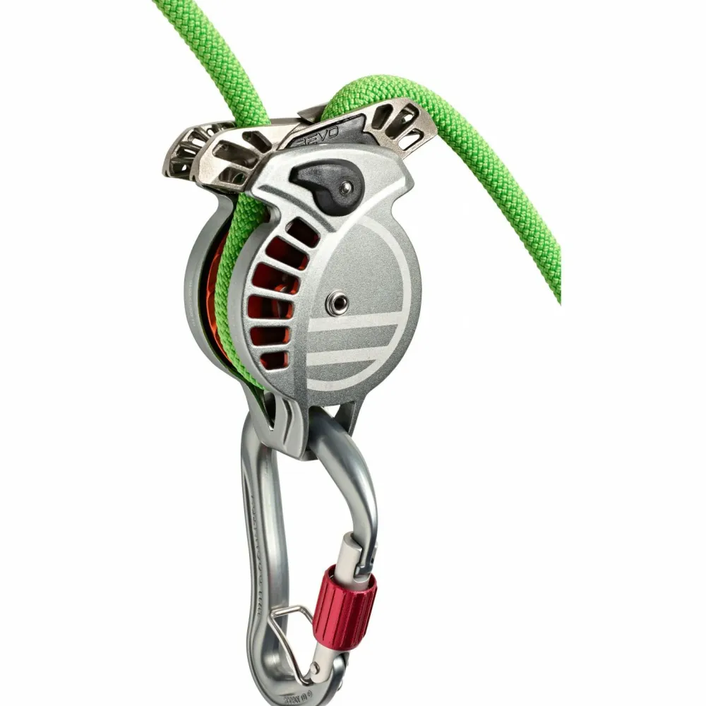 Zur Konstruktion und Funktion des Revo: Das Gerät ist symmetrisch aufgebaut, das heißt, das Seil kann in beide Richtungen eingelegt werden und funktioniert so im Sturzfall auch in beide Richtungen. Der patentierte Bremsmechanismus blockiert das Seil im Notfall (ähnlich einem Sicherheitsgurt im Auto) ab einer Geschwindigkeit von 4 m/s Seildurchlauf und kann nicht übersteuert werden – er ist damit praktisch paniksicher. Sollte das Revo blockieren, kann es durch Zug am Bremsseil wieder gelöst werden. Damit gibt es keine Notwendigkeit der Bedienung eines Ablasshebels.