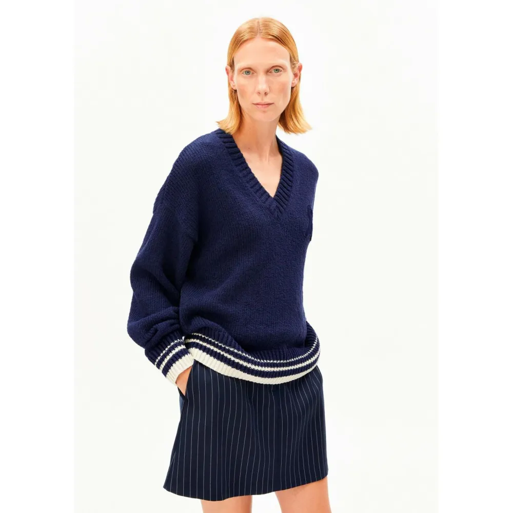 Dank der Verarbeitung von Baumwolle schmiegt sich der Pullover angenehm an Deinen Körper an. Du kannst ihn mit vielen unterschiedlichen Outfits kombinieren. Damit ist er ein echter Allrounder. Ein Pullover für vielseitige Unternehmungen – Women’s Iconic Å College Knit Sweater von ARMEDANGELS.