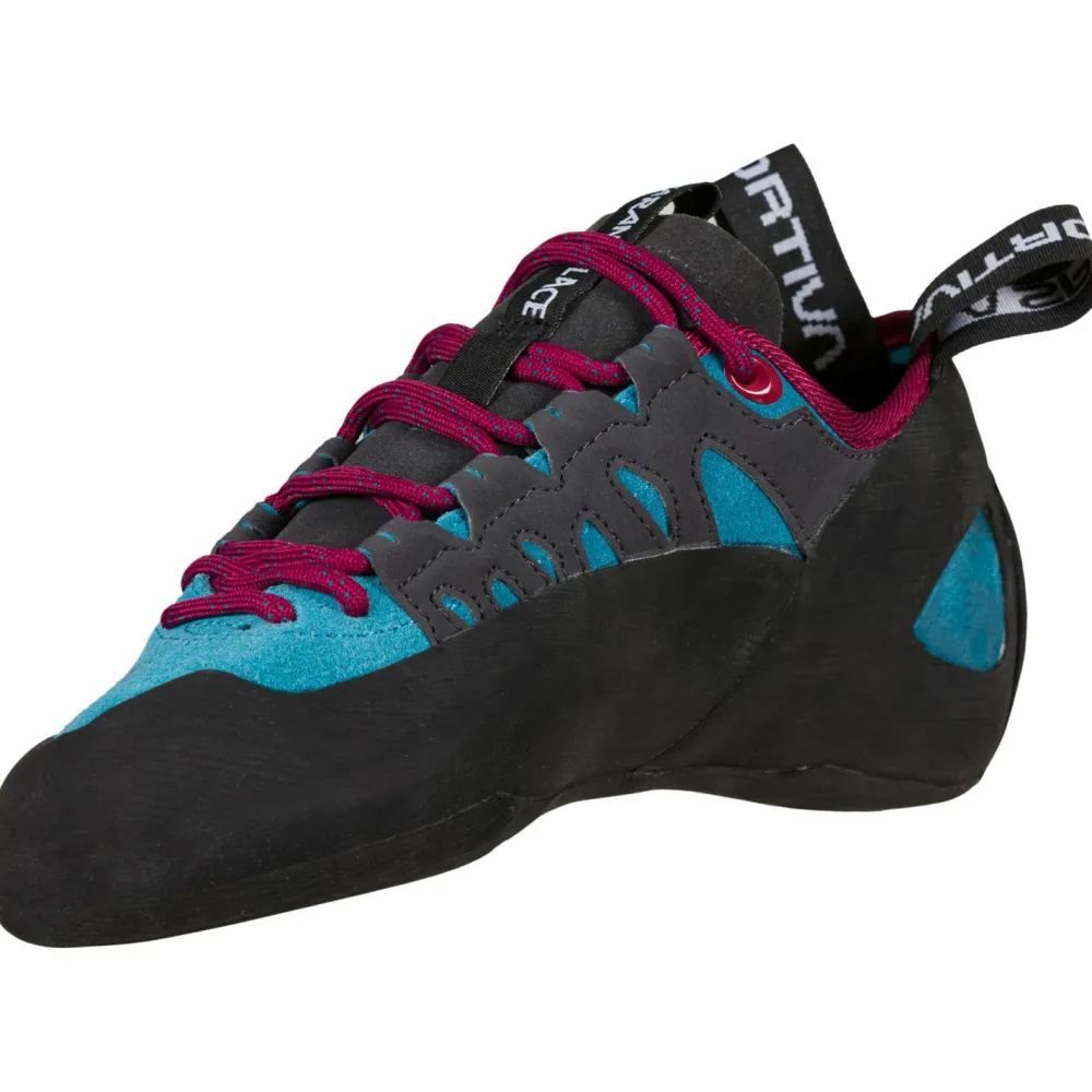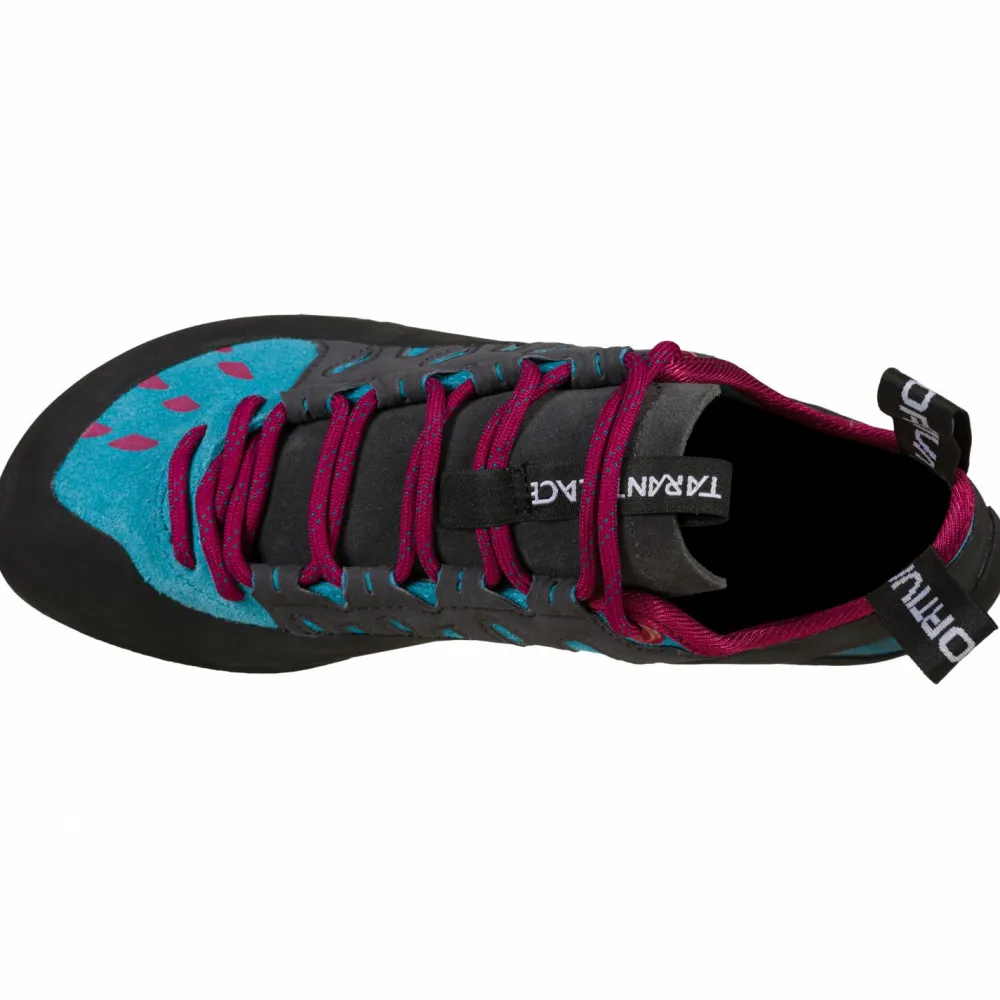 Optimal für den Start ins Indoor-Klettern: die Women’s Tarantulace Kletterschuhe von La Sportiva. Mit der leichten Vorspannung kannst Du Dich super easy an das Klettern an der Wand gewöhnen und hast mit der FriXion Black 4 mm Sohle immer genügend Grip in der Vertikalen. Die Zunge ist schweißableitend und sorgt dafür, dass sich dort keine Falten bilden, die ansonsten drücken würden. Dadurch gibt es einen angenehmen Tragekomfort. Mit der Schnürung kannst Du außerdem selbst entscheiden, wie eng oder locker Du die Schuhe gerne gebunden hättest. Mit der Leder-Oberfläche sind die Women’s Tarantulace robust und langlebig und Du kannst sie sogar wiederbesohlen, wodurch sie noch langlebiger werden.