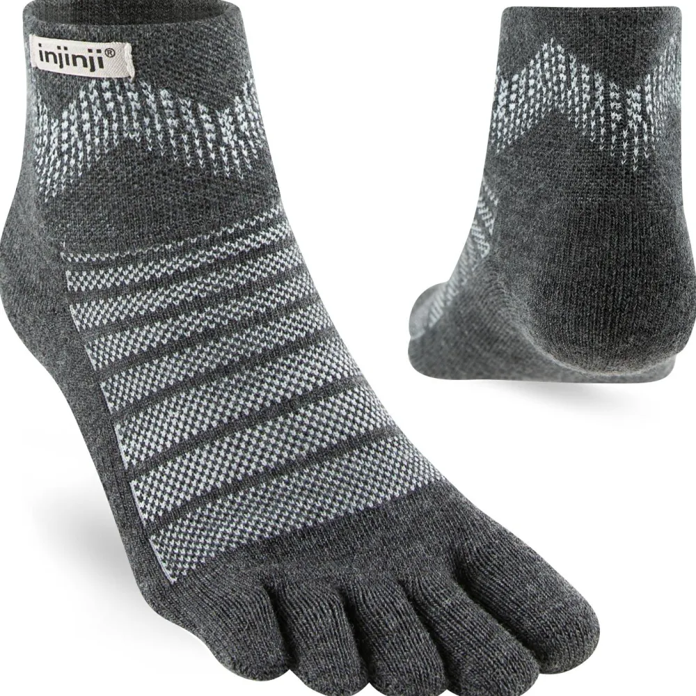 Die Outdoor Midweight Mini-Crew Wool Socken von Injinji sind optimal für sportliche Aktivitäten und den Alltag. Sie bestehen aus einem Merinowoll-Kunstfaser-Mischgewebe und überzeugen mit ihrem Design der getrennten Zehen. Diese haben keine Zehennaht, sodass es nirgends drückt und Blasen gibt. Mit ihrem speziellen Mesh-Einsatz wird der Fußrücken gestärkt und supportet. Darüber hinaus sorgt die Merinowolle auf natürliche Weise durch ihre atmungsaktive und schnelltrocknende Eigenschaft für ein trockenes Tragegefühl. Außerdem bietet sie eine angenehme Temperaturregulierung, die bei kaltem Wetter wärmt und bei warmem Wetter kühlt.