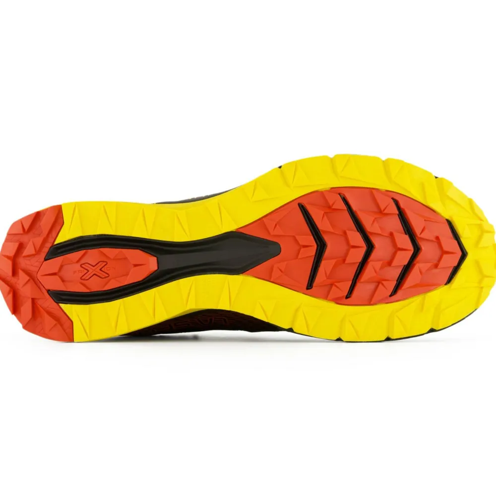 Die spezielle Sohlenkonstruktion aus einer Double Density EVA-Zwischensohle mit Infinitoo-Pads aus weichem Polyurethan und einer FriXion Red-Außensohle überzeugt durch eine äußerst gelungene Balance aus Griffigkeit, Dämpfung und Reaktionsfähigkeit. Eine Steinschutzplatte bietet zudem Schutz auf spitzen Untergründen. Dadurch sind die Schuhe sowohl auf technisch anspruchsvollen Passagen, wo Stabilität und Grip gefragt ist, als auch auf flowigen Trails, wo sie für ein rollendes Laufgefühl sorgen, zu Hause. Die spezielle Noppenanordnung des Impact Brake Systems verbessert den Aufprallschutz und vor allem die Bodenhaftung beim Bergablaufen zusätzlich.