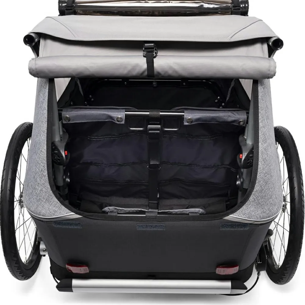 - inkl. Fahrrad-Set (Deichsel, Sicherheitswimpel, 1 Kupplung); Buggy-Set (Buggyrad); Schlüsselset für das Deichselschloss; 2in1-Wetterverdeck; Kopfpolster; Höhenverstellbarer Schiebebügel; Batterierücklicht
