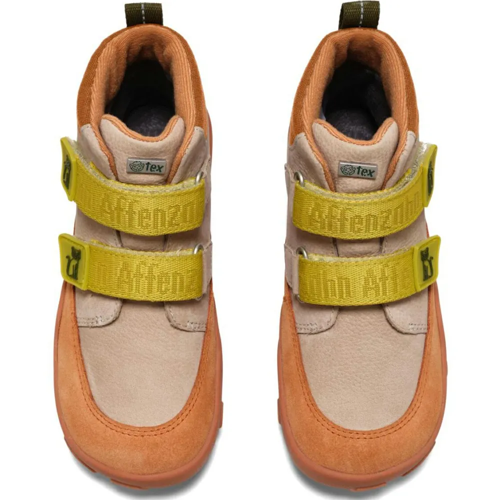 Mit dem Kid’s Übergangsschuh Leder Friendy von Affenzahn sind kleine Entdecker bestens ausgestattet – besonders, wenn draußen Matsch, Laub und Pfützen auf sie warten. Das Obermaterial besteht aus glattem und angerautem Leder, das Leather Working Group zertifiziert ist – für verantwortungsvoll hergestellte Qualität, die überzeugt. Innen sorgt ein kuscheliges Fleecefutter für angenehme Wärme, während der gepolsterte Kragen aus Baumwoll-Polyester-Gemisch für zusätzlichen Tragekomfort sorgt. Die integrierte AffenTex-Membran schützt zuverlässig vor Nässe und lässt gleichzeitig Feuchtigkeit nach außen entweichen – ideal für wechselhaftes Übergangswetter. Die flexible Außensohle aus 70 % synthetischem und 30 % natürlichem Gummi sorgt für sicheren Halt – auch bei nassen Untergründen.