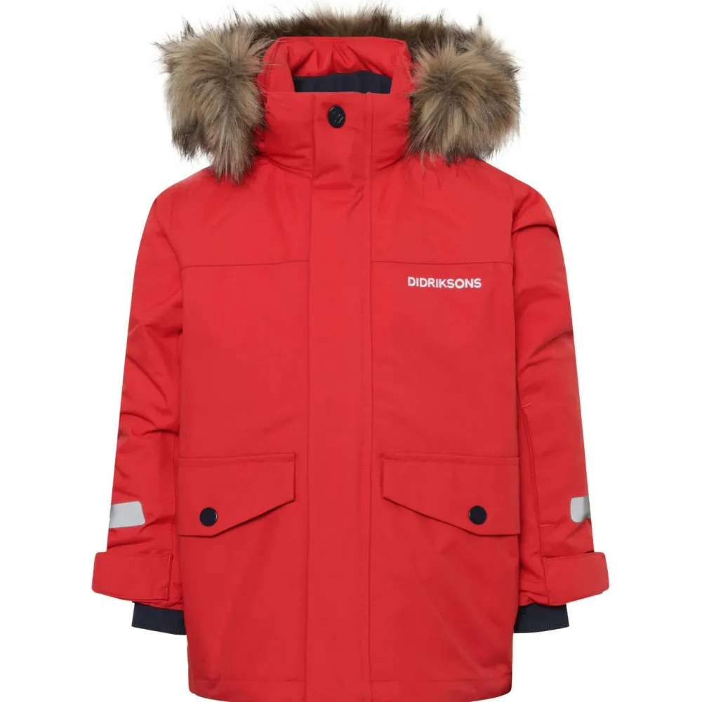 Für den Einsatz bei kaltem Wetter ist die Kid’s Bjärven Parka 4 von Dridriksons bestens geeignet. Diese Winterjacke kann aber nicht nur im Alltag getragen werden, sondern punktet vielmehr auch bei Freizeitaktivitäten, wenn das Thermometer deutlich unter null Grad anzeigt. Das Außenmaterial ist dabei wetterfest und kann auch anhaltenden Niederschlag problemlos abhalten. Im Inneren der Jacke sorgt eine hochwertige Kunstfaserfüllung zuverlässig für einen guten Wärmerückhalt.