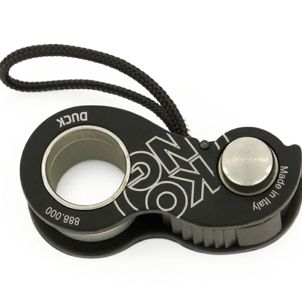 Eine Steigklemme der besonderen Art: die Duck von Kong! Im Gegensatz zu herkömmlichen Steigklemmen lässt sich dieses Modell auch mit Bandmaterial verwenden – um z.B. die Länge von Bandschlingen zu regulieren – primär ist es allerdings für Einfachseile mit einer Durchmesser von 8 bis 13 mm geeignet. Der Federmechanismus des Geräts blockiert selbsttätig und lässt sich auch mit einer Hand gut bedienen, zudem ist das Karabinerloch so großzügig dimensioniert, dass sich ein Schraubkarabiner komplett darin drehen lässt.