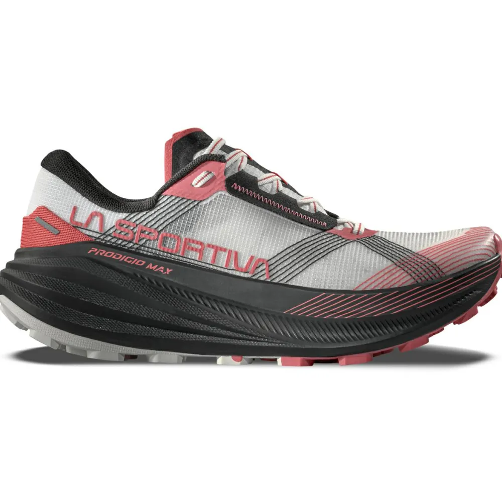 Die sind gemacht für maximale Performance: die Women’s Prodigio Max von La Sportiva sorgen auf Gelände-Runs über mittellange bis lange Etappen für topp Komfort, festen Grip, Stabilität und Halt, also nichts wie los Richtung Bestleistung!