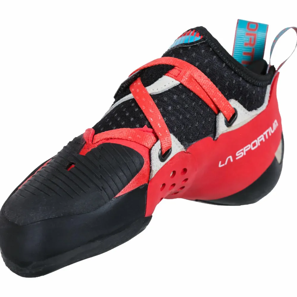 Ein Klettverschluss hält die Schuhe in Position und ermöglicht außerdem das schnelle Aus- und Anziehen während eines Klettertags. Weitreichende Gummierungen geben den Schuhen zusätzliche Stabilität und schützen gleichzeitig das Obermaterial. Besonders: Die Ferse und der Zehenbereich wurden bei diesem Modell verstärkt und ermöglichen so das zuverlässige Hooken. Gerade bei den schwierigen Toehooks sorgt die Gummierung im Zehenbereich für eine optimierte Unterstützung. Bei der Ferse hingegen wurde auf ein schmales Profile geachtet, was wiederum das präzise Setzen von Heelhooks erleichtert.