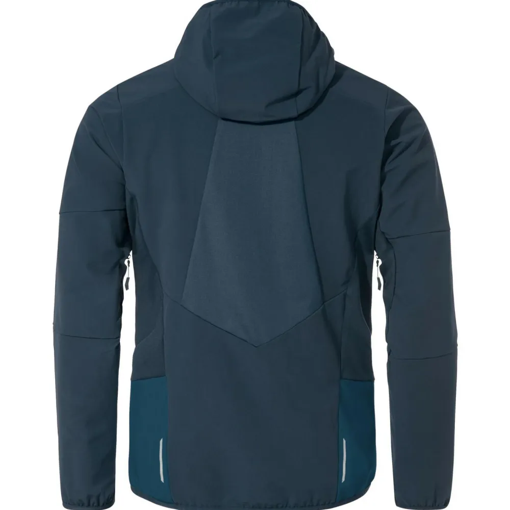 Die Larice Jacket V von Vaude ist eine sportlich geschnittene Skitouren-Softshelljacke für Herren. Am meisten Kälte verliert man im Winter über den Kopf. Die Kapuze ist angeschnitten und sitzt so perfekt am Kopf. Damit kann man sich die Mütze sparen. Kapuze, Armbündchen und Saum sind mit Lycra Band eingefasst, so verrutschen diese nicht. Wenn man zum Beispiel einen Rucksack trägt der sich etwas auf dem Rücken bewegt, schiebt sich die Jacke nicht unangenehm im Rücken zusammen, sondern bleibt gerade liegen und hält alles warm. Der Reißverschluss ist gewendet und mit Untertritt versehen, so ist er robust, leicht auf- und zu machbar und man kann sich nicht einklemmen. Für Wertgegenstände, LVS und Müsliriegel gibt es zwei Fronttaschen, sowie eine Brusttasche mit Reißverschluss. Auch wenn man einen Gurt anhat ist die Brusttasche gut erreichbar und somit perfekt für die Unterbringung des LVS, wenn Du ihn nicht in der Halterung tragen möchtest.