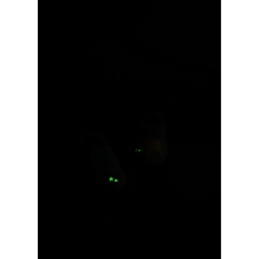 Dank elastischem Gummiband sitzt der Schuh sicher am Fuß – ganz ohne Schnürung oder Klettverschluss. Die rutschfeste Naturkautschuksohle in Naturfarbe gibt Halt auf glatten Böden. Das Highlight: Die aufgenähte Applikation leuchtet im Dunkeln und macht den Hausschuh zum echten Hingucker.