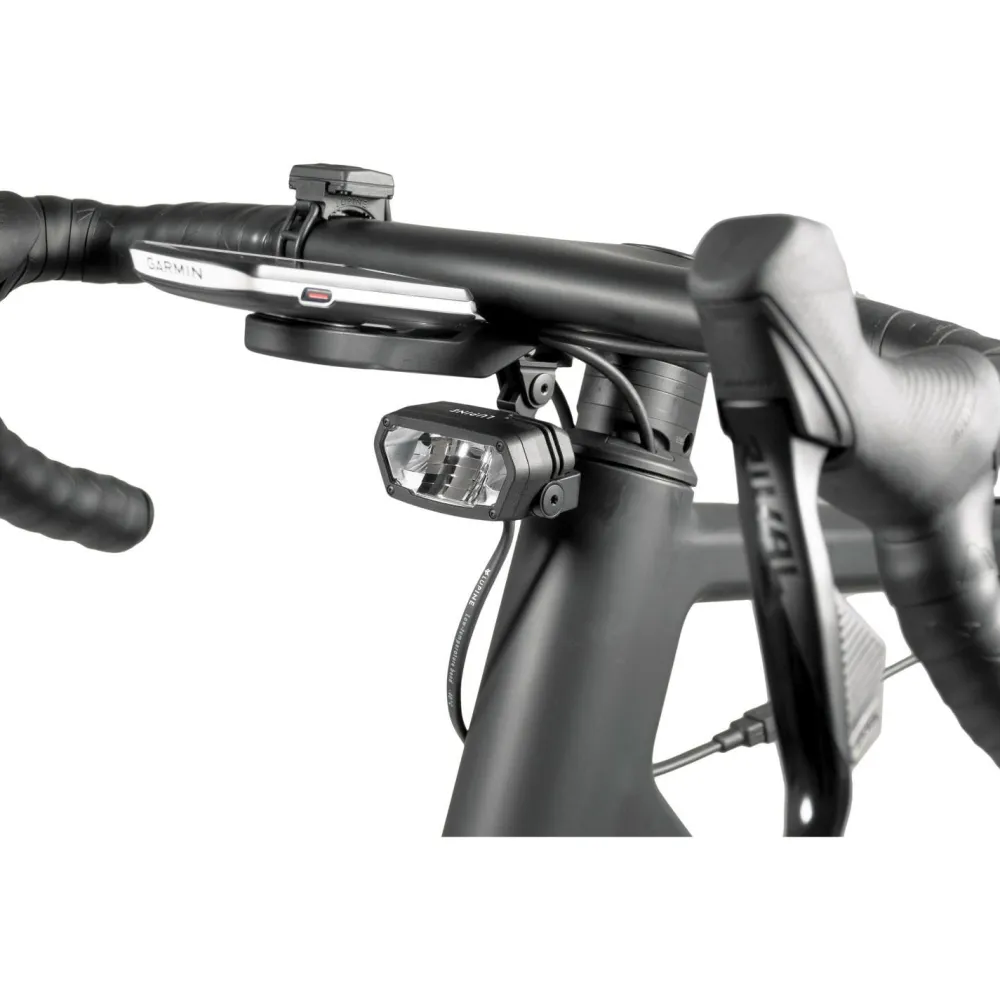 Als Cockpit Halterung dient der Garmin Aero Cockpit Halter von Lupine zur praktischen Montage von Garmin, Wahoo und GoPro an Aero Lenkern. An der Halterung aus gefrästem Aluminium kann die SL Grano Lampe an der Unterseite fixiert werden, während Garmin oder Wahoo gut sichtbar auf der Oberseite platziert werden. Je nach Montagewunsch kann weiteres Zubehör für die Montage notwendig sein.