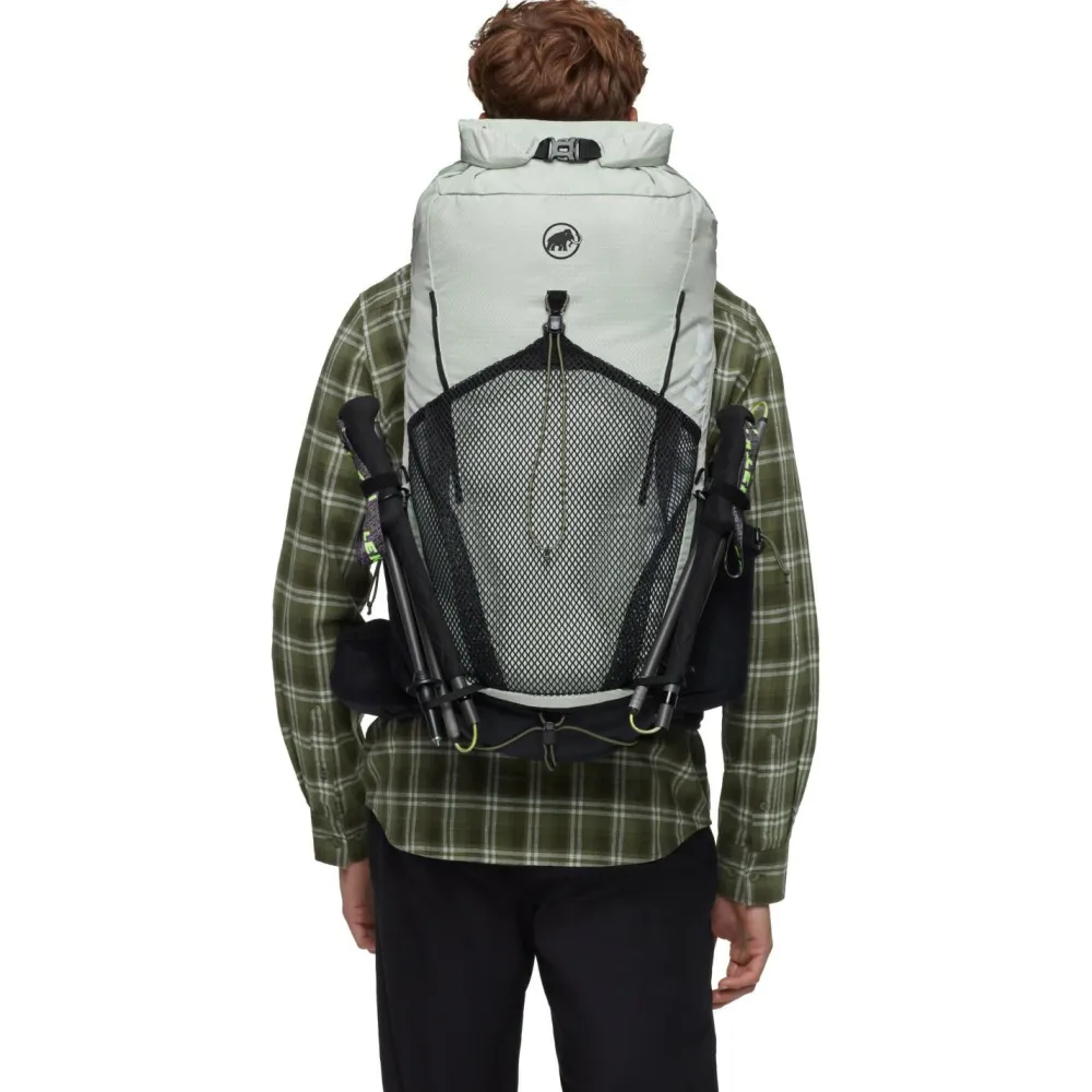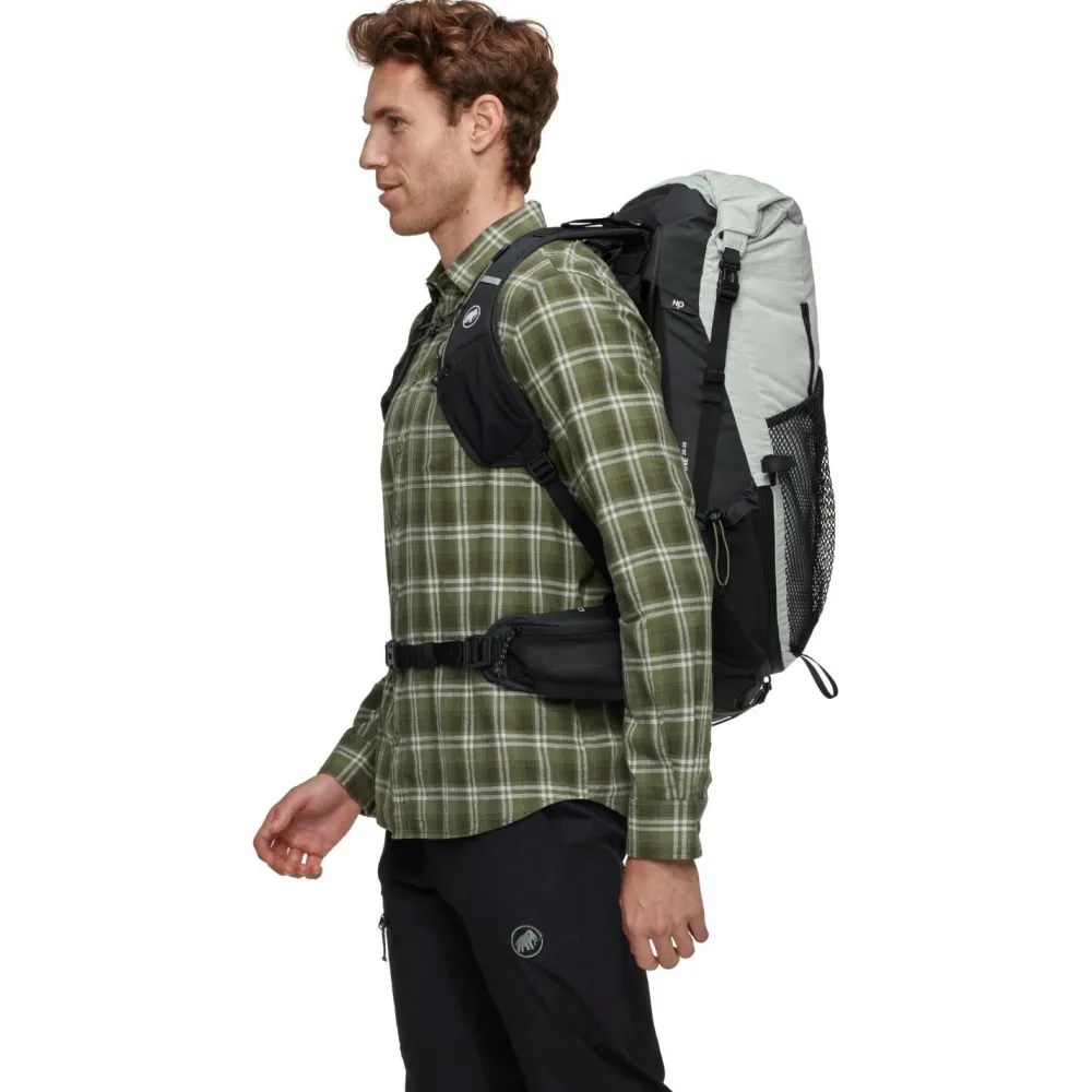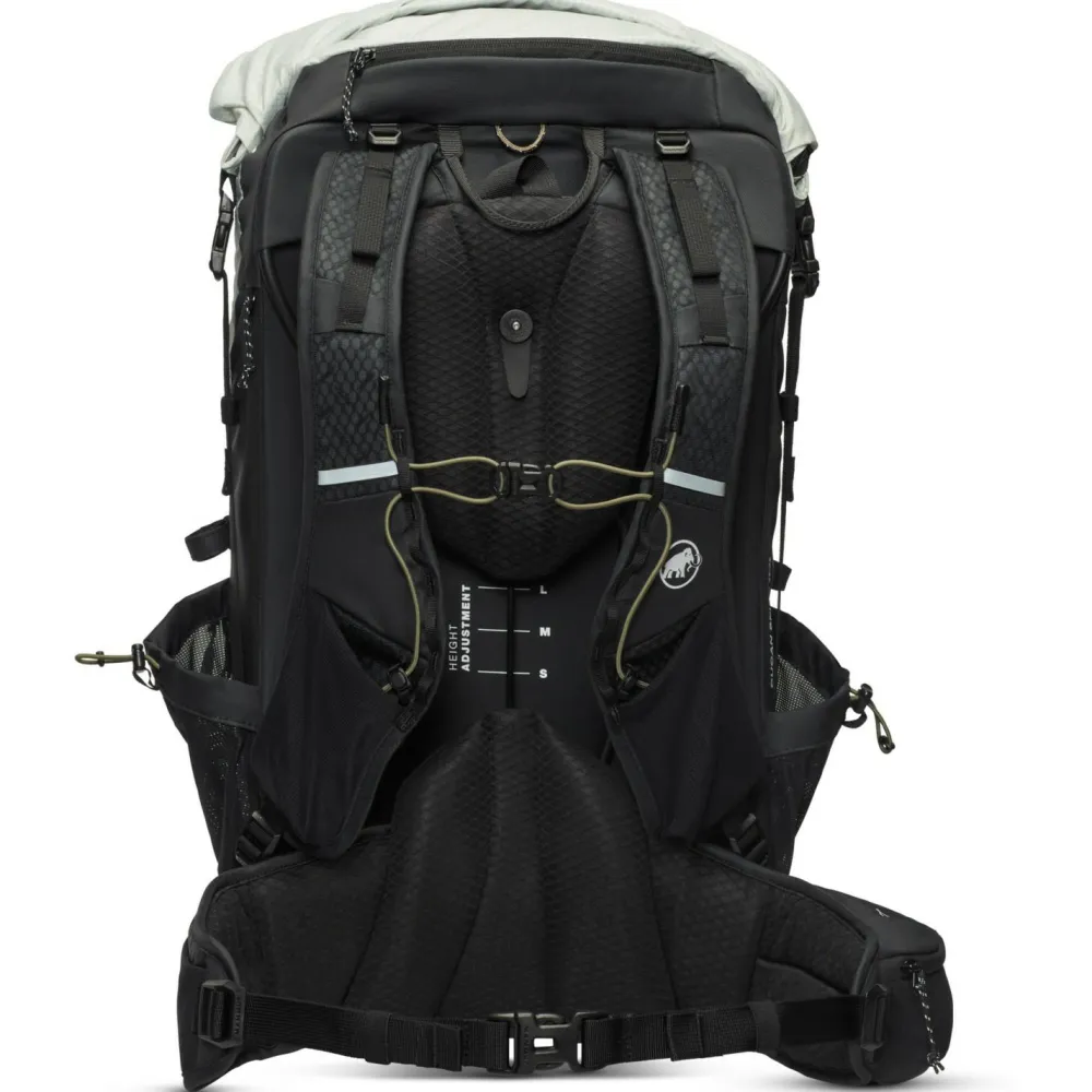 Der Ducan Spine 28-35 Wanderrucksack von Mammut lässt sich mit seinem Rolltop-Verschluss mit zusätzlichem Reißverschluss perfekt anpassen. Je nach Wanderung kann er mit 28 Liter bis maximal 35 Liter Gepäck beladen werden und bietet damit tolle Flexibilität. Der Wanderrucksack ist außerdem am Rücken anpassbar und macht das Laufen mit der Active Spine Technology besonders komfortabel und effizient. Für angenehme Belüftung sorgen ein Netzrücken und ein bestens belüftetes Tragesysteme mit Mesh-Taschen an den Schulterträgern und Reißverschluss-Tasche am Hüftgurt. Zusätzlich verfügt der flexible Rucksack für Tagestouren über seitliche Netztaschen, Lastenkontrollriemen und einen integrierten Metallrahmen für optimale Kraftübertragung.