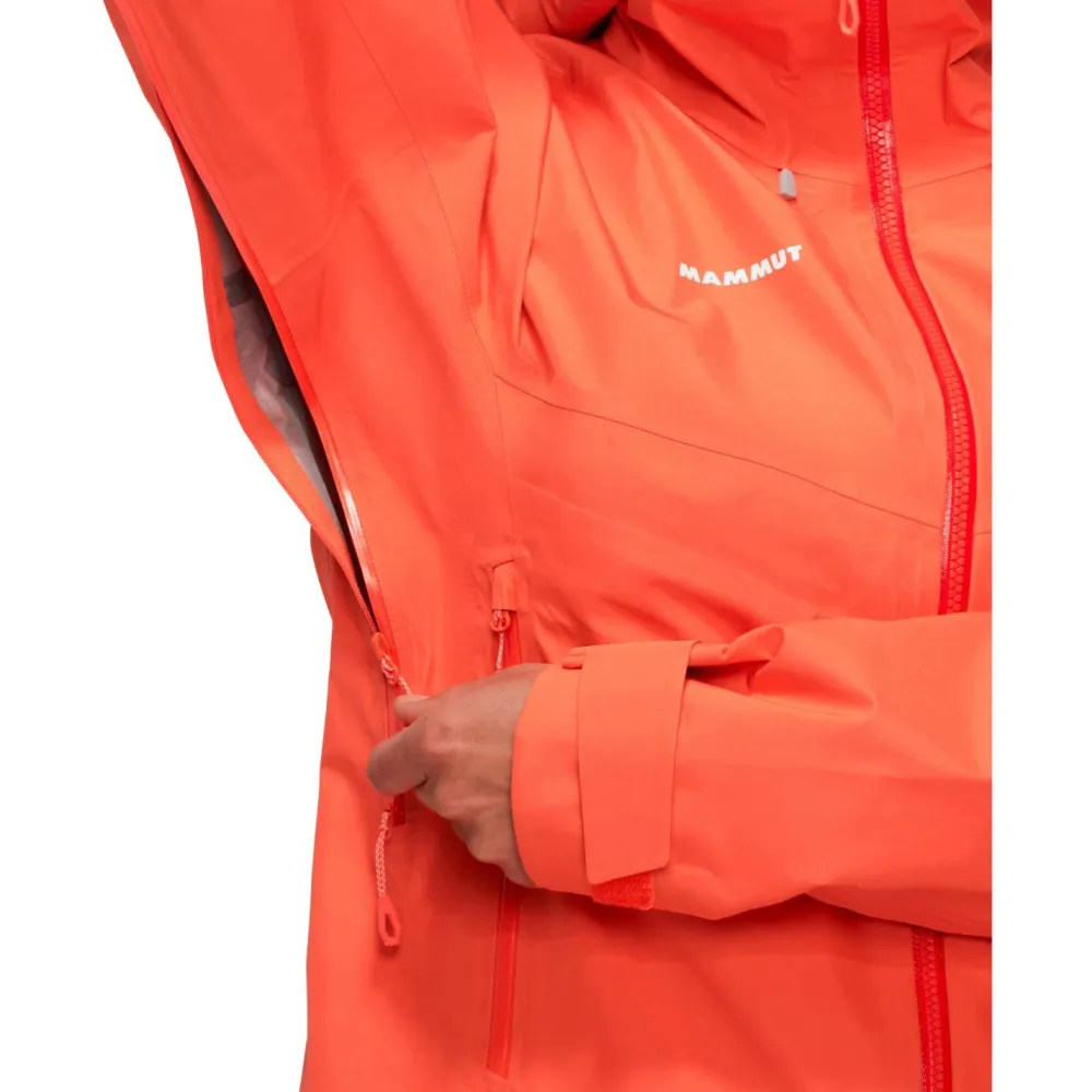 Die dreilagige Regenjacke wird aus recycelten Rohstoffen gefertigt und ist als bluesign und Fair Wear Produkt ausgesprochen umweltfreundliche. Durch ihre atmungsaktive Membran und die praktischen Unterarmreißverschlüsse zur Belüftung unterstützt die Jacke Bergsteigerinnen perfekt beim Auf- und Abstieg. Die Mammut High Reach Technology sorgt dabei für erstklassige Beweglichkeit beim Klettern. Für ausreichend Stauraum sorgen zwei hoch angesetzte Fronttaschen, die auch mit Klettergurt jederzeit gut erreichbar sind. Eine Innentasche und praktische Einstellmöglichkeiten an Saum und Ärmelabschlüssen machen die strapazierfähige Women’s Crater IV Hardshell Hooded Jacket komplett.