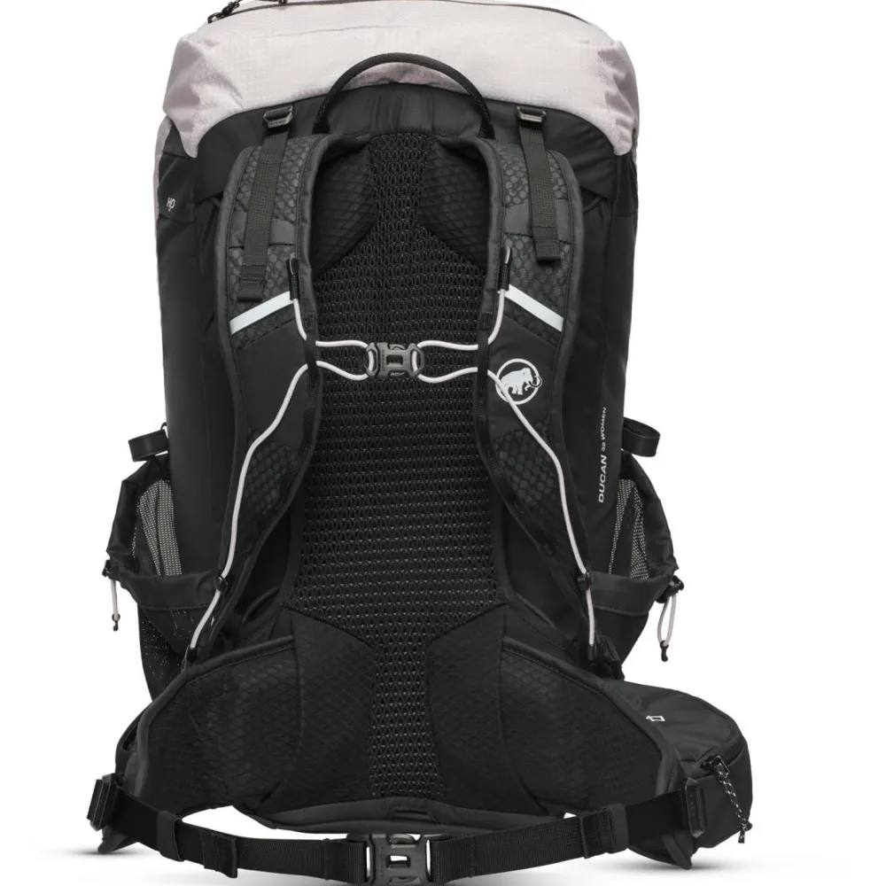 Mit 32 Liter Volumen bietet der Women’s Ducan 32 Wanderrucksack von Mammut genügend Stauraum für ausgedehnte Wanderungen und Bergtouren. Dabei unterstützt ihn sein gut belüfteter Netzrücken, ein stabilisierender Metallrahmen und ein besonders atmungsaktives und ergonomisch vorgeformtes Tragesystem. Der Wanderrucksack ist kompatibel für die Verwendung von Trinksystemen und verfügt zusätzlich über zwei praktische Seitentaschen für Trinkflaschen. Das Material mit Polyester und Polyamid ist wasserabweisend und wird bei Nässe und Regen zusätzlich durch eine abnehmbare Regenhülle geschützt. Mammut stattet den Toploader mit Deckelfach und Halterungen für Trekkingstöcke aus. Hüftgurt, Brustgurt und Tragegriff machen den leichten Wanderrucksack für Tagestouren komplett.