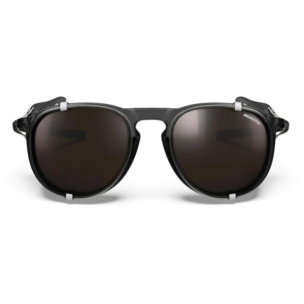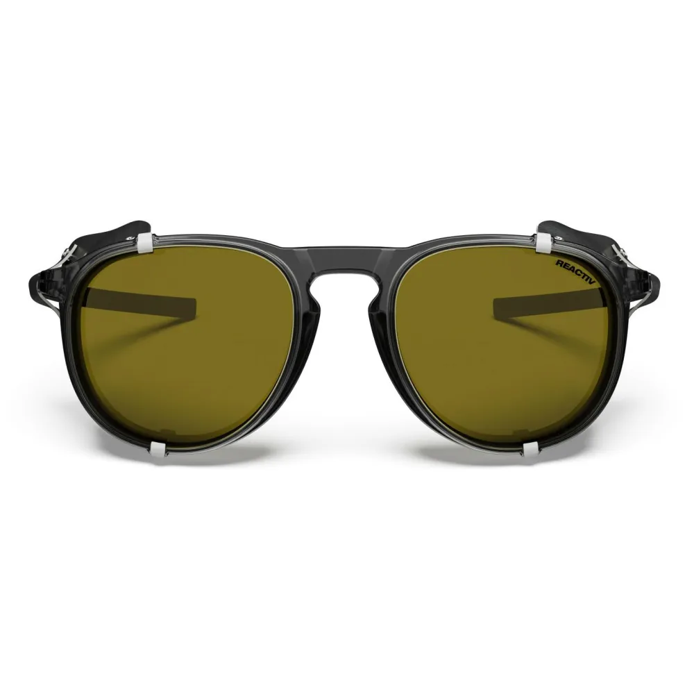 Sieht gut aus und kann was, die Millenium Reactiv Polarized S2-4 (VLT 5-20%) von Julbo. Diese Gletscherbrille wurde in erster Linie auf die Verwendung im Hochgebirge ausgelegt, kann aber auch darüber hinaus punkten. Der Rahmen ist dabei äußerst robust und sitzt aufgrund der beschichteten und gewölbten Bügel immer sicher und angenehm. Die abnehmbaren Seitenteile sorgen zuverlässig dafür, dass kein grelles Licht hinter die Brille gelangt. Die Gläser sind bei diesem Modell selbsttönend und entsprechen je nach Lichtintensität den Schutzklassen 2-4.