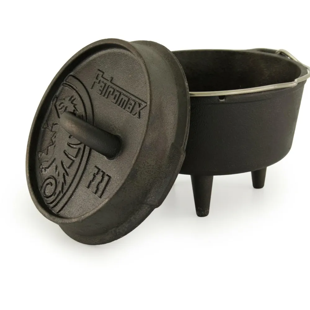 Durch die hervorragenden Eigenschaften des Gusseisens und die spezielle Oberflächenstruktur wird die Wärme effizient gespeichert und weitergeleitet. Die vorbehandelte Oberfläche (seasoned finish) macht ein erstmaliges Einbrennen unnötig und der robuste Feuertopf kann sofort verwendet werden. Im Freien wird er auf dem offenen Feuer oder mit Holzkohle verwendet. Der erhöhte Rand des Deckels ermöglicht es, Glut oder Holzkohle auch auf dem Feuertopf zu platzieren. So wird der Feuertopf von allen Seiten beheizt und eignet sich beispielsweise auch zum Brot backen.