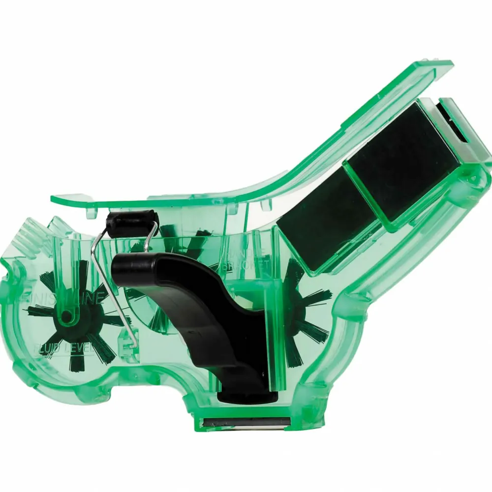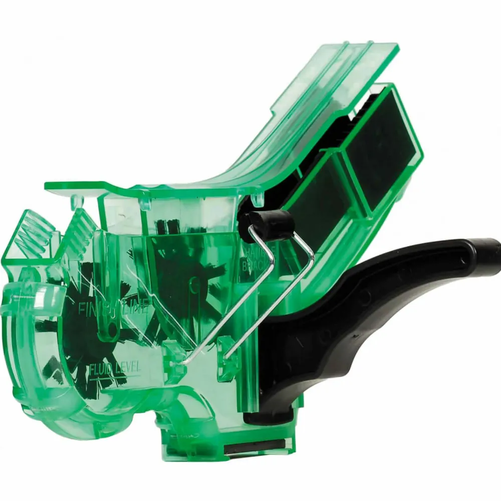 Schnelle, einfache und effiziente Kettenreinigung direkt am Rad wird mit dem Kettenreinigungsgerät von Finish Line möglich! Die Kette muss zur Reinigung praktischerweise nicht abgenommen werden. Die Bürsten reinigen in Verbindung mit seitlichen Abstreifblättchen die Kette zuverlässig. Ein Magnet sammelt außerdem den Metallabrieb auf.