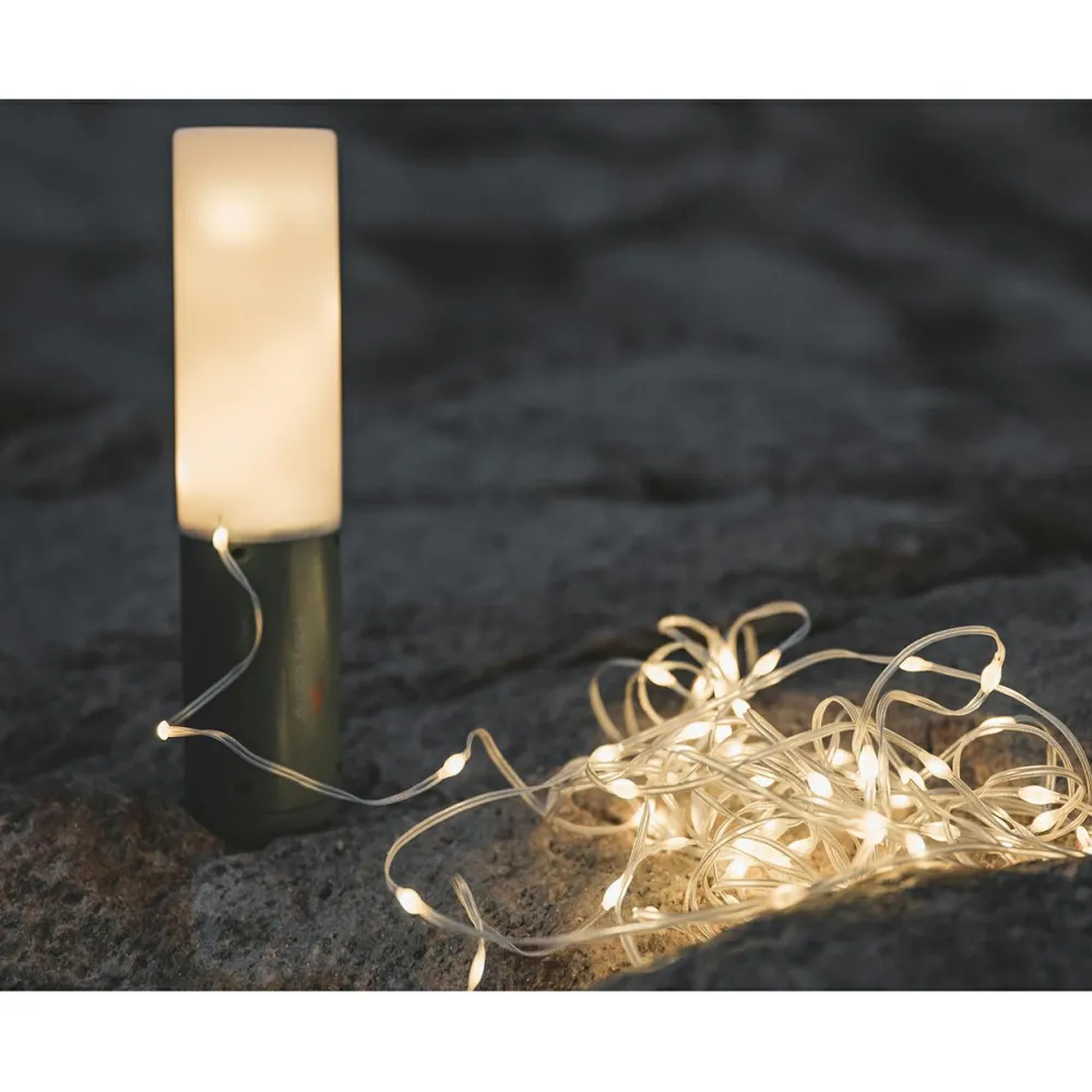 Die Lupin Stringlight Lantern von Easy Camp bringt Licht ins Dunkel. Diese LED-Lampe kommt vor allem beim Camping zum Einsatz und kann entweder auf den Tisch gestellt oder an der dafür vorgesehenen Öse aufgehängt werden. Das Licht ist dabei dimmbar und die Farbtemperatur einstellbar. Der integrierte Akku wird über einen USB-C-Anschluss geladen. Zusätzlich lässt sich die Lampe auch als Powerbank verwenden.