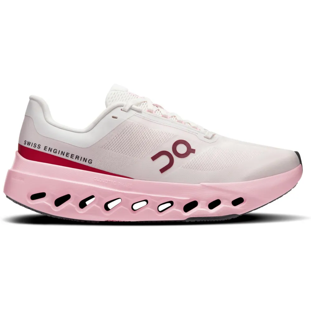 Sowohl im Training als auch beim Wettkampf begleiten Dich die On Women’s Cloudsurfer Next Runningschuhe. Neben dem patentierten CloudTec-System, das eine besonders weiche Landung, aber gleichzeitig einen kräftigen Abstoß fördert, wurde auch eine ganz spezielle Prägung auf der Außensohle verarbeitet. Diese neue Form bietet optimalen Halt und Traktion, besonders bei nassen und etwas rutschigem Asphalt. Durch die Mittelsohle, die aus hochwertigem EVA besteht, ist der Schuh zum einen besonders strapazierfähig und langlebig und die Stoßdämpfung wird zusätzlich unterstützt.
