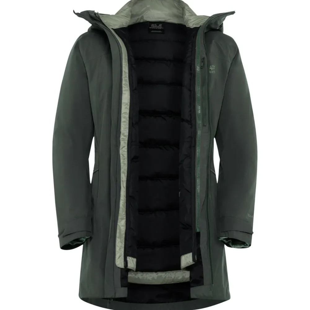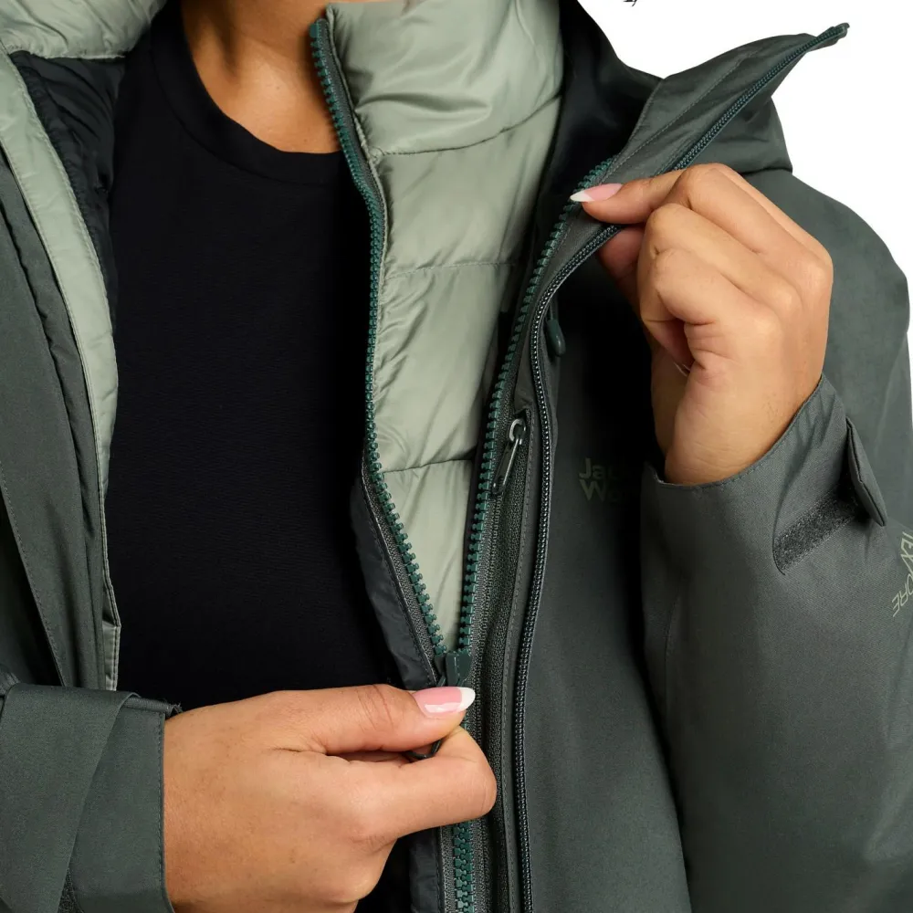 Die Women’s Icecape 3in1 Down Jacket RDS von Jack Wolfskin kannst Du vielseitig tragen. Sie ist atmungsaktiv, schnelltrocknend, wasser- und winddicht und zudem isolierend. An besonders kalten Tagen kannst Du die Jacke zusammen mit der Innenjacke tragen. Wenn die Temperaturen milder sind, kannst Du beide Jacken auch separat voneinander anziehen.