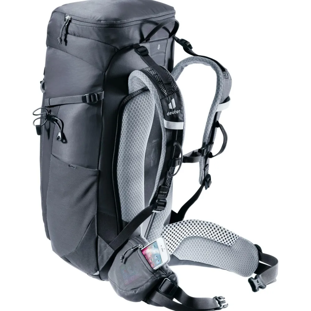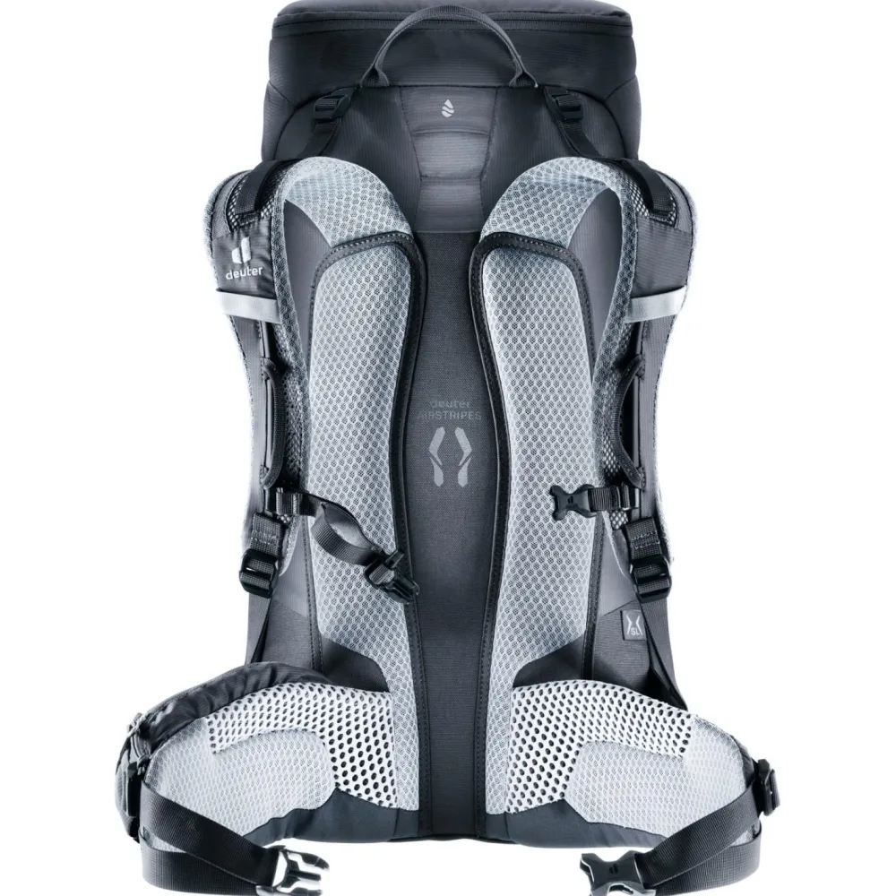 Den perfekte Sitz am Körper auch bei intensiven Klettereinlagen garantieren das Airstripes Rückensystem, die beweglichen Schulterträger und die Hüftflossenkomprimierung mit ihrer leichtgängigen Pull-Forward-Verstellung. Die Netz-Hüftflossen sind außerdem ergonomisch geformt und verstaubar, die Schulterträger warten mit einer Karabiner-Fixierung für das Klettersteigset auf.