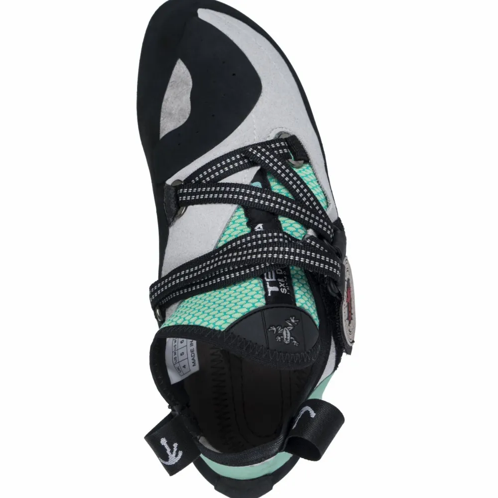 Speziell an die Anatomie von Frauenfüßen angepasst – egal ob man vertikale Wände, Überhänge oder Boulderprobleme zu bewältigen hat, der Oasi LV von Tenaya wurde so konstruiert, dass man mit ihm unterschiedliche Herausforderungen angehen kann. Das Design des Schuhs liefert optimales Feedback bei jeder Bewegung am Fels, um den Fuß richtig zu platzieren. Die Vibram XS Grip Sohle sorgt für optimale Haftung an der Wand und unterstützt die Füße bei jedem Klettervorhaben. Das spezielle Klettverschluss-System erlaubt schnelle und individuelle Anpassung an die eigenen Füße. Die aggressive Vorspannung hält die Fersen tiefer, um eine ideale Performance zu gewährleisten. Trotz agressiver Vorspannung und asymmetrischer Form verbindet dieser Schuh Performance mit Komfort und bietet die Unterstützung an der Wand, die man braucht.