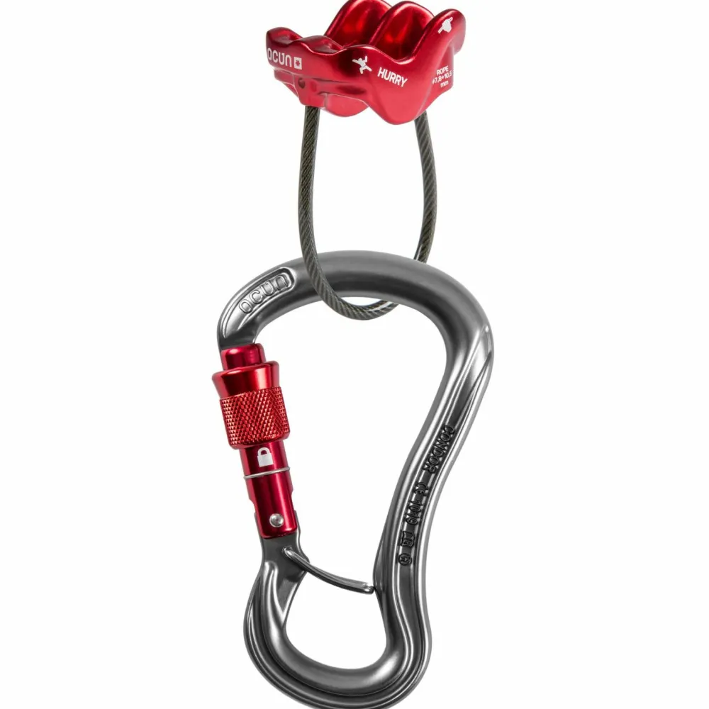 Zum Condor gesellt sich das Sicherungsgerät Hurry mit klassischer Tube-Konstruktion: mit diesem können Kletterer beim Ablassen gesichert werden, wenn man nur einzelne Seillängen klettert und keine Standplätze einrichten muss. Zwei verschiedene Reibungsmodi regulieren und reduzieren dabei den Kraftverbrauch des Sichernden. Das Sicherungsgerät eignet sich gleichermaßen für Einfach- und Doppelseile. Mit einem Gewicht von unter 140 Gramm bringt das Ocun Belay Set Condor/Hurry auch nicht zu viel Gewicht auf die Waage – so kann die nächste Route kommen!