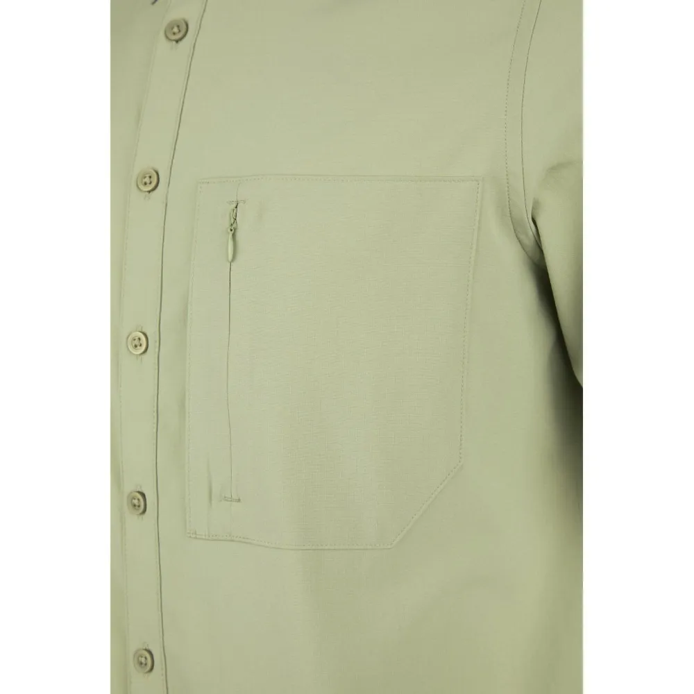 Neben dem funktionalen Material punktet das Hemd mit einer durchgehenden Knopfleiste, die das An- und Ausziehen erleichtert. Die Brusttasche mit Reißverschluss ist dezent, aber nützlich – perfekt für kleine Dinge wie eine Fahrkarte oder etwas Bargeld. Der abgerundete Saum sorgt für einen lockeren Sitz, der auch optisch was hermacht. Und wenn Du mal ins Schwitzen kommst oder das Hemd nach einem langen Tag waschen musst: Es ist bei 30 °C maschinenwaschbar und damit pflegeleicht genug für jeden Reisetag.