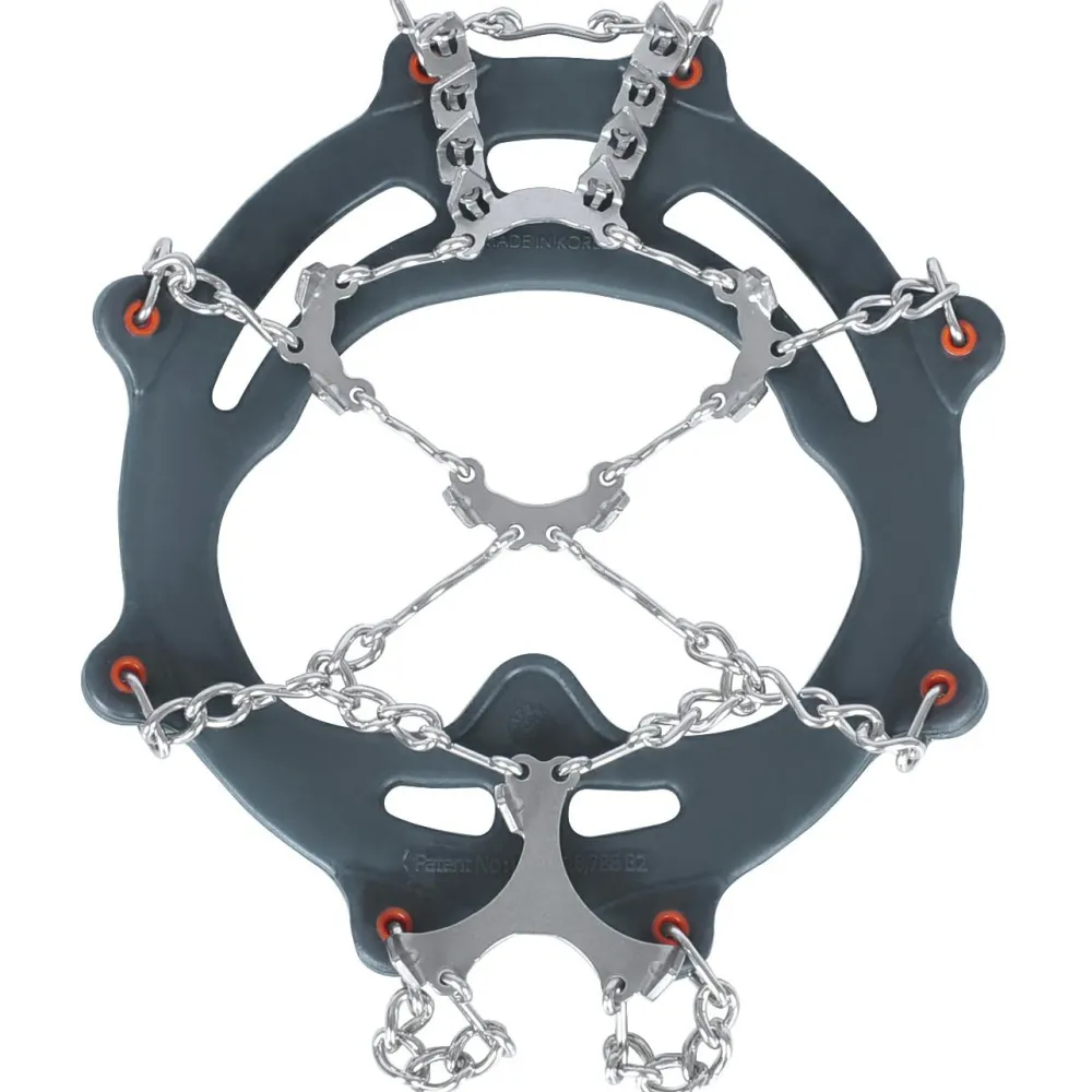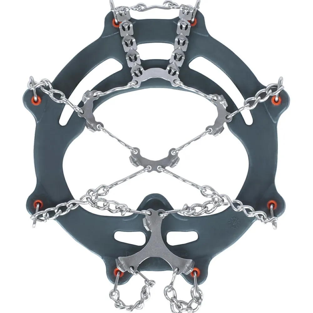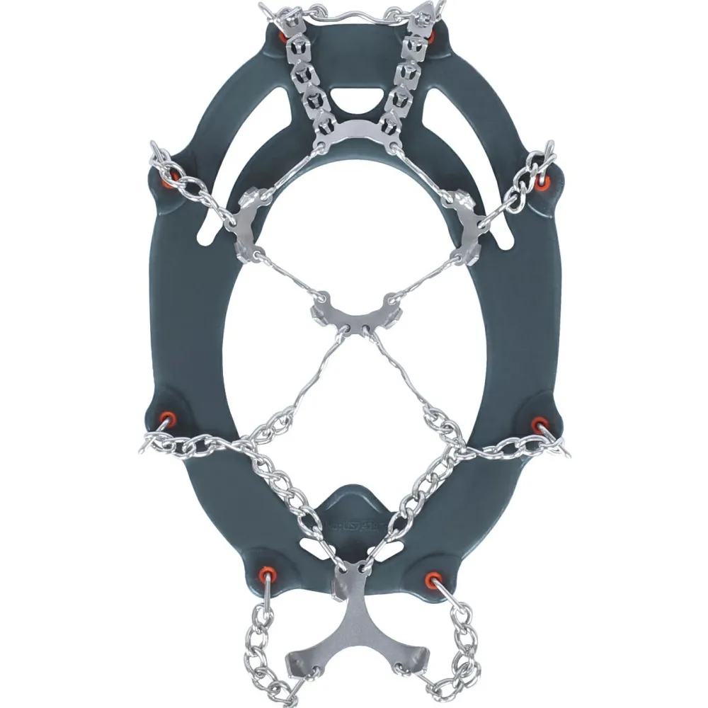 Die Spikes Chainsen Pro XT kommen dann zum Einsatz, wenn bei kaltem Wetter mehr Grip erforderlich ist. Eine Besonderheit sind die Zacken vorne an der Schuhspitze, die in steilem Gelände zusätzliche Trittsicherheit geben. Ob man nun bei einer Winterwanderung unterwegs ist, beim Schlittenfahren in den Bergen oder ob man bei kalten Temperaturen gerne zum Trailrunning geht, diese Grödel sorgen für den nötigen Halt auf kompaktem und eisigem Untergrund. Die ca. 1cm langen Zacken sind aus rostfreiem Edelstahl. Durch den robusten Elastomer-Gummi, der bis -60° C getestet wurde, sitzen die Grödel fest am Berg- oder Arbeitsschuh. Mit diesen Grödel ist man bei seinen Outdoor-Aktivitäten und bei der Arbeit sicher ausgerüstet.