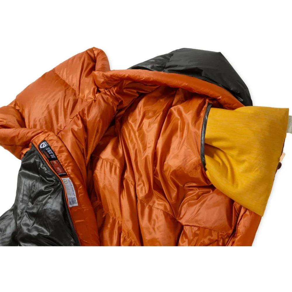 Nemo befüllt den Disco 30 Endless Promise Daunenschlafsack mit einer hochwertigen Füllung aus RDS-zertifizierter Daune mit 650 cuin Bauschkraft. Als Obermaterial und Innenmaterial dient recyceltes Polyester, das zusätzlich mit einer wasser- und schmutzabweisenden DWR-Behandlung ausgestattet ist. So bleibt die Daunenfüllung auch bei Feuchtigkeit zuverlässig trocken.