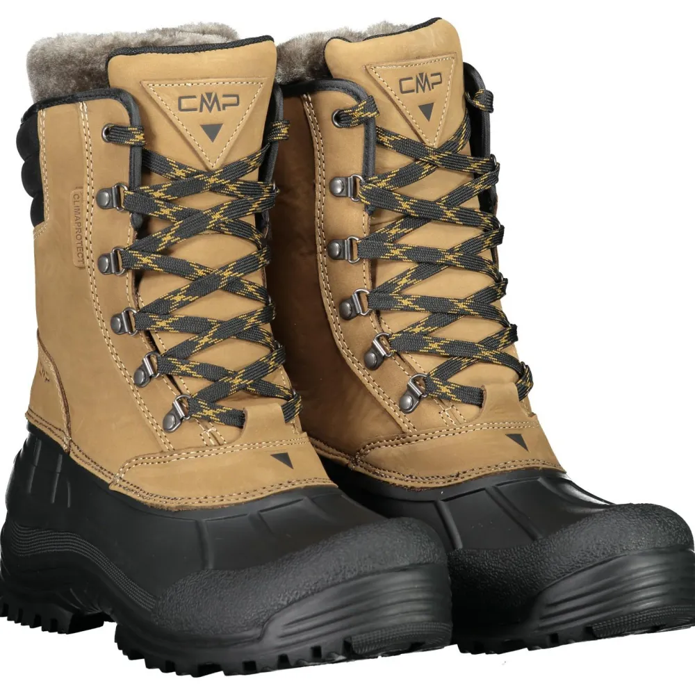 Der untere Teil der Kinos Snow Boots Waterproof Winterschuhe besteht aus wasserdichtem und abriebfestem TPR, das auch intensiver Nässe, Schnee und Schneematsch souverän widersteht. Für besten Halt auf Schnee und Eis sorgt eine griffige und grob profilierte Gummisohle. Mit einer hohen Schnürung werden die warmen CMP Stiefel sicher und bequem verschlossen. Eine praktische Anziehschlaufe erleichtert das Anziehen der hohen Stiefel.