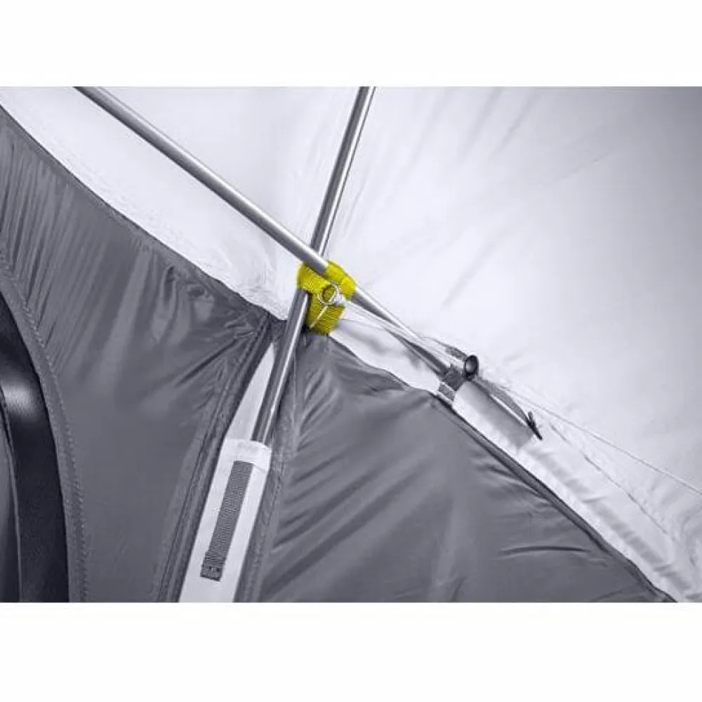 Das Litetrek III 3-Personenzelt bietet allerlei Platz für erholsamen Schlaf und trockenes Equipment. Zu dritt lässt es sich in Nullkommanix aufbauen und bietet viel Stauraum für das Gepäck in der Apside. Viele Features und das geringe Gewicht überzeugen bei häufigem Auf- und Abbau. Die ausgeklügelte Stangenkonstruktion hält das Zelt auch ohne Abspannung in Form. So lässt es sich auch an engen Stellen gut platzieren. Die Gestängebögen liegen zum größten Teil frei und können so mit Clips schnell fixiert werden. Wer schon einmal im Regen ein Zelt aufgebaut hat, wird wissen, wie viel das Wert ist. Der Boden im Eingangsbereich ist integriert und muss nicht separat eingehängt werden. So können dreckige Schuhe und das Equipment trocken gelagert und auch bei Regen entspannt gekocht werden. Super praktisch ist auch die Möglichkeit zur Erweiterung des Eingangsbereichs. Für eine gute Belüftung des 3-Personeneltes sorgt eine Ventilationsöffnung unterm Dach, die über Reißverschlüsse von innen und außen bedient werden können. Die spezielle Konstruktion der reflektierenden Abspannleinen sorgt für zusätzliche Stabilität bei windigen Wetterlagen. Zur Organisation der Abspannleinen beim Zusammenpacken des Zeltes dienen Kordelverschlüsse zur Fixierung. Die Leinen sind reflektierend, sodass man sie auch im Dunkeln gut sieht. Für den Fall der Fälle gibt Salewa ein Reparaturset dazu, um bei kleinen Rissen Schlimmeres zu verhindern. Das Litetrek III von Salewa ist ein komfortables Zelt für Naturfreunde und hält so manchem Unwetter ohne Probleme Stand