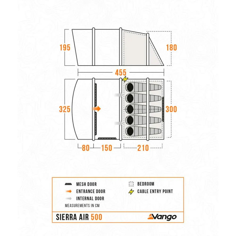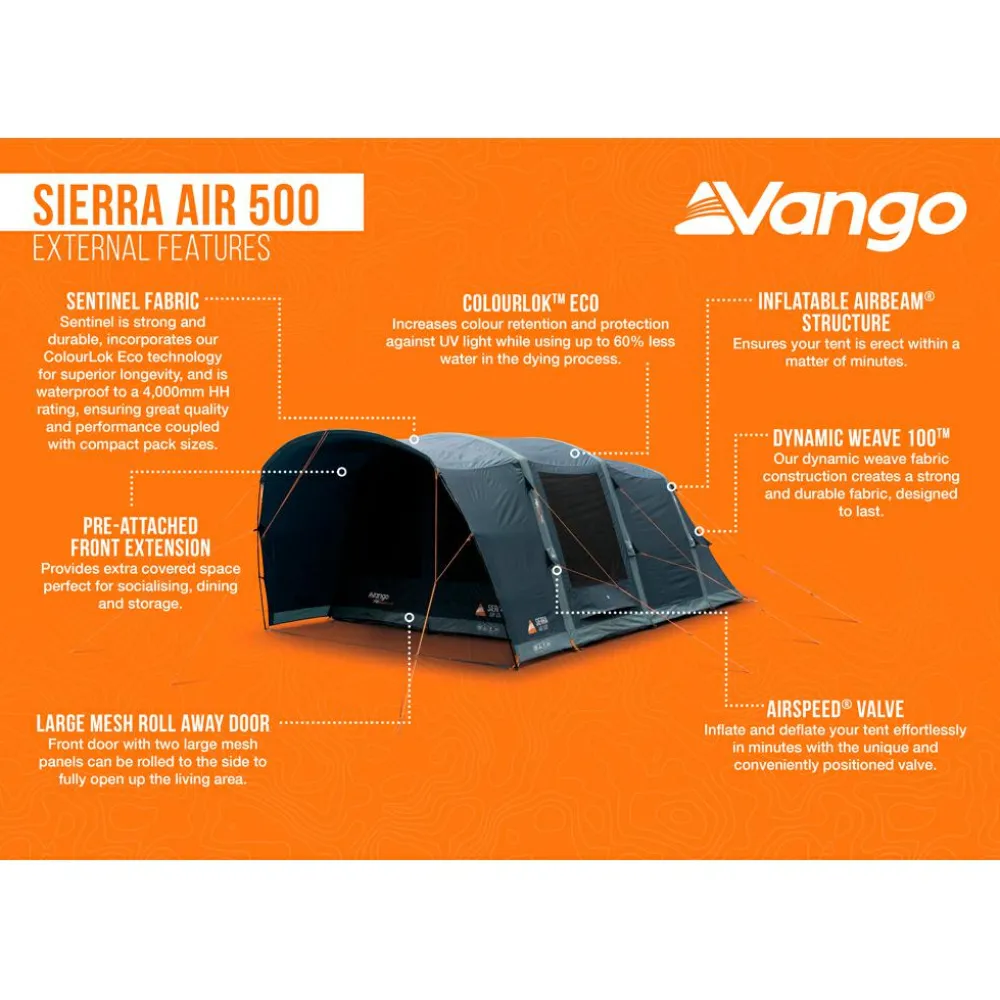 Das Sierra 500-Dreipersonenzelt von Vango ist der ideale Begleiter für den Familienurlaub im Sommer. Dieses Zelt kommt mit der stangenlosen AirBeam-Technologie, die komplett ohne Gestänge auskommt, indem mit Luft gefüllte Kanäle für die nötige Stabilität sorgen. Der komfort-technische Schwerpunkt liegt dabei auf einer optimalen Belüftung. Mehrere Mesh-Paneele und ein zusätzliches Mesh-Paneel hinter den Schlafkabinen sorgen dafür, dass Dein Zelt auch bei warmen Temperaturen angenehm kühl bleibt. Das Dynamic Weave 100™-Gewebe bietet ein geringes Packmaß und Gewicht, ohne dabei an Qualität und Haltbarkeit einzubüßen. Die King Size Midnight Bedrooms ermöglichen einen komfortablen Schlaf und bieten ausreichend Platz für jede Person. Das vormontierte Vordach schafft zusätzlichen Lebensraum und ein echtes Outdoor-Gefühl.