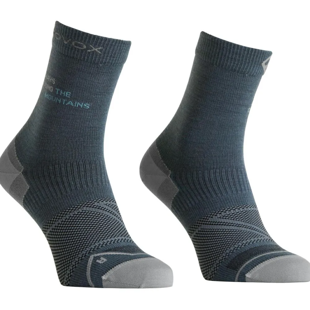Ortovox kombiniert bei diesen Wandersocken Merinowolle mit hochwertiger Kunstfaser, damit Deine Füße stets optimal temperiert und trocken bleiben. Die Merinowolle reguliert die Temperatur und leitet Feuchtigkeit zuverlässig ab, während die Kunstfaser für Strapazierfähigkeit und Formstabilität sorgt. Das Ergebnis: Ein angenehmes Fußklima und langlebiger Tragekomfort – ideal für ausgedehnte Touren in den Bergen oder spontane Ausflüge ins Grüne.