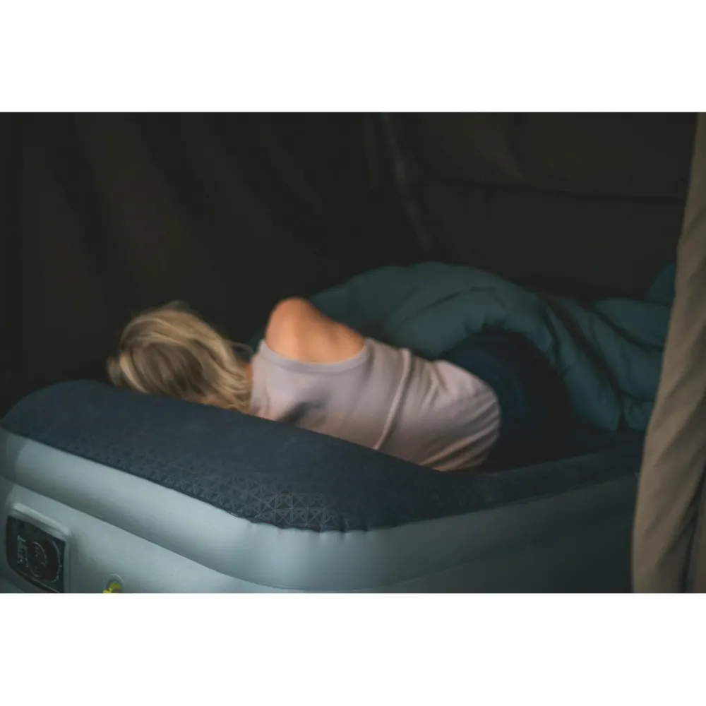 Das Outwell Superior Single mit eingebauter Pumpe ist ein hohes Luftbett für Camping, Reisen oder den Einsatz als Gästebett und bietet eine komfortable Schlaflösung mit einfachem Handling. Mit einer Liegefläche von 195 × 90 cm und einer Höhe von 45 cm liegt man deutlich über dem Boden, was das Ein- und Aussteigen erleichtert. Die Unterseite besteht aus einer stabilem PVC-Basis, während die Oberseite aus Rayon angenehm weich ist.